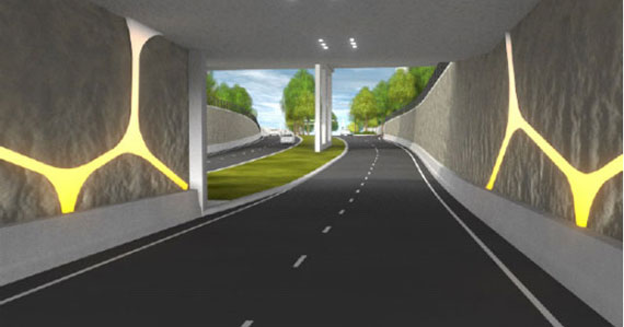 Ontwerp van de nieuwe tunnel, met het geraamte van LED-verlichting. Het licht past zich aan aan de hoeveelheid daglicht. Op deze manier wordt er niet meer stroom verbruikt dan noodzakelijk. (Beeld: gemeente Emmen)