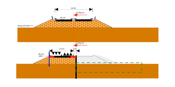 Bouwfase 2: damwand / geluidscherm plaatsen in berm, rijbaan aan weerszijden uitreiden, damwand scheiding terp en bouwput plaatsen, terp noordzijde verwijderen. (Illustratie: Rijkswaterstaat)