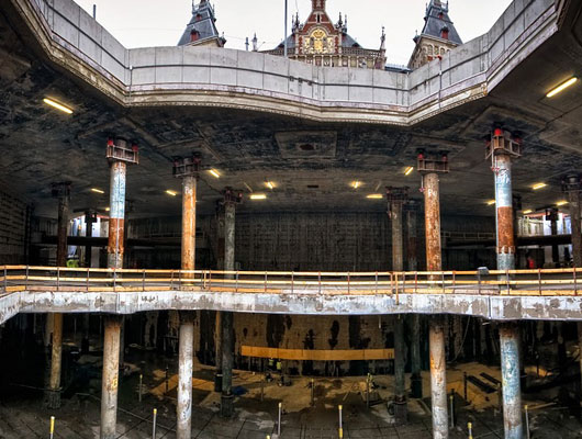 Werken aan het metrostation onder het voorplein van Amsterdam Centraal. (Foto: Dienst Noord/Zuidlijn)