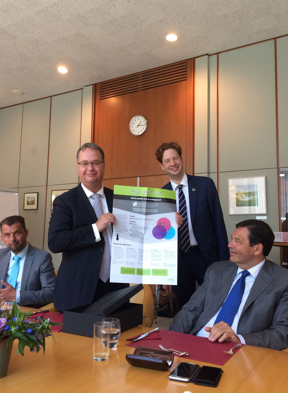 Geert Roovers (lector Bodem en ondergrond aan Saxion) overhandigde op het COB-congres een samenvatting van de ketenanalyse is in de vorm van een poster aan Floor Vermeulen (gedeputeerde van de provincie Zuid-Holland). Floor heeft de poster vervolgens doorgegeven aan Han Weber, gedeputeerde voor de energietransitie. De poster en de achterliggende notitie zijn te downloaden vanaf de projectpagina.