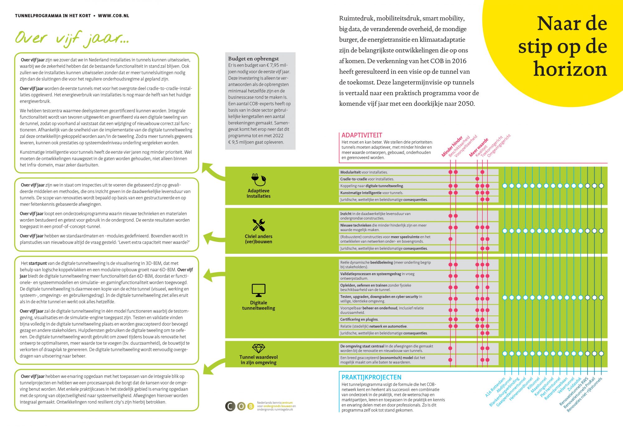 Het tunnelprogramma omvat drie doelen en vier ontwikkellijnen voor de komende vijf jaar, met een budget van 7,9 miljoen euro en een rendement van 9,5 miljoen euro. Het COB gaat volgende maand met belangrijke spelers in het netwerk in gesprek om een startkapitaal te verzamelen. De ambitie is om op het COB-congres, 3 november 2017, het startschot te geven voor de uitvoering van het tunnelprogramma.