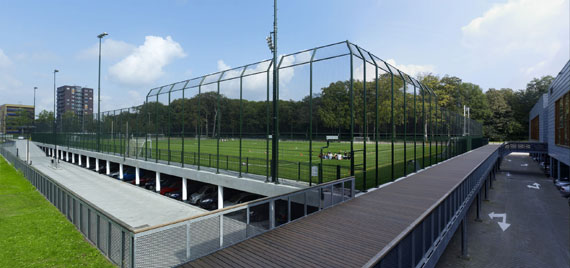 Het Gymnasion in Nijmegen bevat een ondergrondse parkeergarage met bovengronds sportveld. (Beeld: Royal Haskoning)