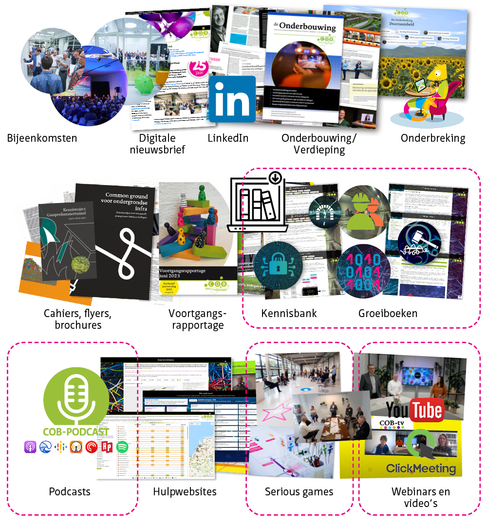 Groot, klein, fysiek, digitaal, tekst, beeld, geluid … Om het netwerk in stand te houden en de ontwikkelde kennis onder de aandacht te brengen, gaat het COB weinig uit de weg. Heeft een werkgroep iets nodig wat nog niet op de lijst staat? Geen probleem, het COB is altijd in voor iets nieuws en heeft veel creativiteit en kunde in huis om ideeën zelf tot uitvoering te brengen.