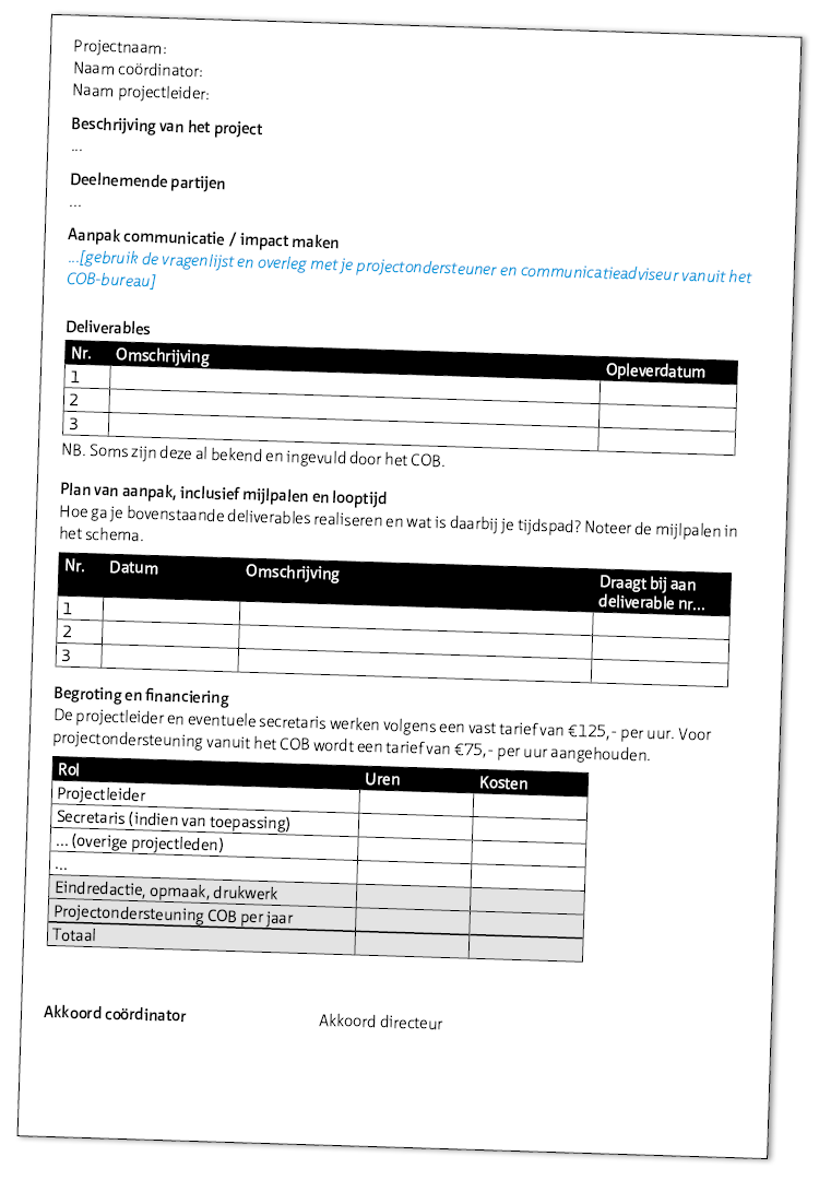 De eerste stap van een COB-project is altijd hetzelfde: er is een projectplan (format, 84 KB) nodig. In de meeste gevallen wordt een projectleider aangesteld die daarmee aan de slag gaat. De coördinator en directeur van het COB denken mee en geven uiteindelijk hun goedkeuring. Het projectplan kent een vast format, zodat er bijvoorbeeld altijd stilgestaan wordt bij het maken van impact, belangrijke tussenstappen en de verdeling van de uren.