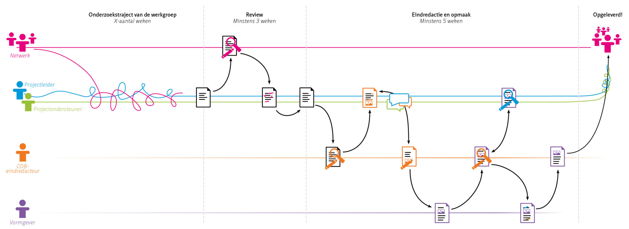 Deze stappen hebben gevolgen voor de planning. Een reviewronde kost minstens drie weken, en de eindredactie en opmaak door het COB minstens vijf weken, afhankelijk van de drukte op dat moment. Dat betekent dat de inhoud van een deliverable minstens acht weken vóór de opleverdatum gereed moet zijn.