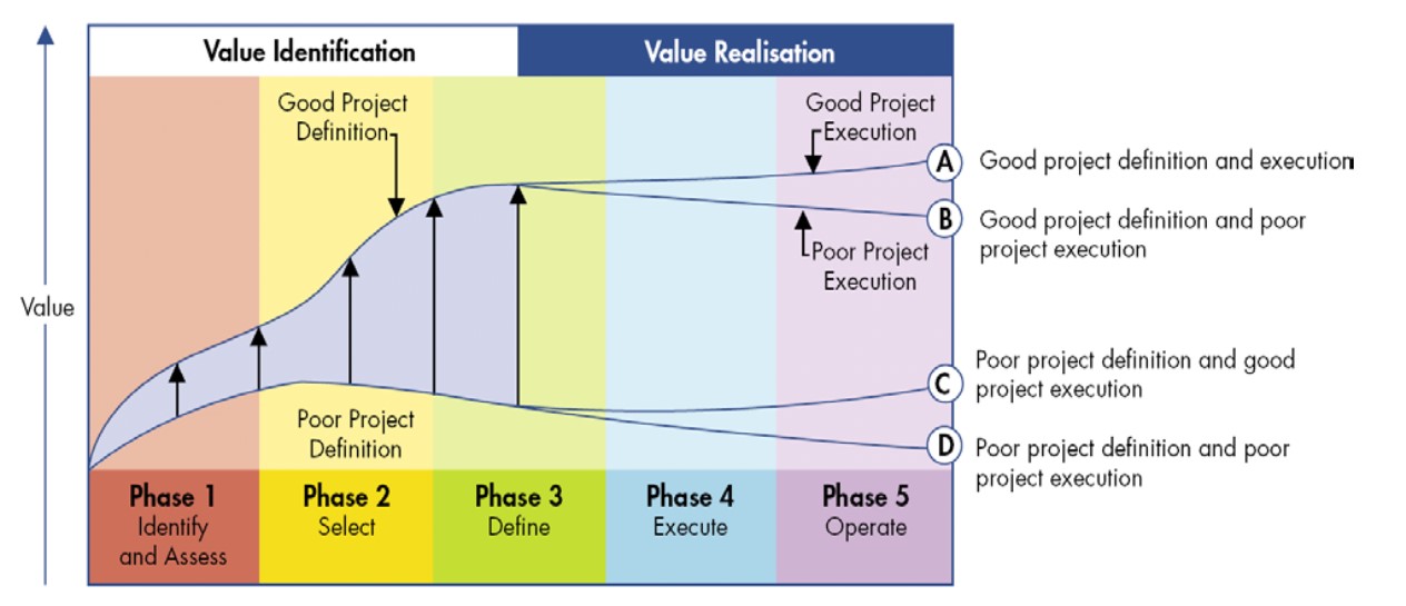 De Management of Engineering Projects-cursus (MEP) richt zich op het managen van grootschalige complexe technische projecten en legt daarbij de focus op ‘frontend loading’ en het persoonlijke aspect. Onder frontend loading wordt verstaan dat het investeren aan de voorkant van een project voor een groot deel de kwaliteit en/of waarde van het project bepaalt; dit is visueel weergegeven in Figuur 1. Het persoonlijke aspect richt zich op de stelling dat de mensen op een project het succes bepalen. De slogan van de cursus werd dan ook vaak herhaald en luidt “People are key”: de sleutel naar het succes ligt bij het managen van alle medewerkers en stakeholders van een project.