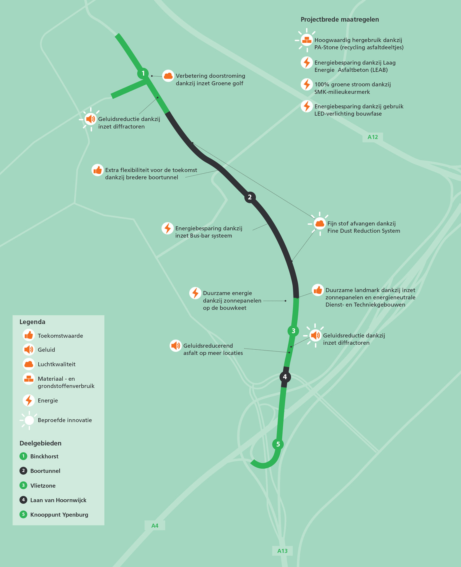 Sommige duurzaamheidsmaatregelen betreffen de aanlegfase, terwijl andere meer zijn gericht op de gebruiksfase. Maar er is ook gekeken naar hergebruik van materialen aan het einde van hun levensduur. Reinoud Goudswaard: “We maken gebruik van hoogwaardig herbruikbaar asfalt. Het is een volwaardige cradle-to-cradleoplossing van BAM, waarbij met een speciale techniek de bitumen kunnen worden verwijderd en het asfalt volledig herbruikbaar is.” Martin Potter: “We hadden zelfs het voornemen de tunnelboormachine nog een keer in te zetten voor de tunnel in de RijnlandRoute, maar die tender hebben we helaas niet gewonnen.”