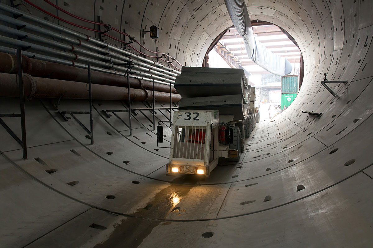 Speciale segmentenwagens rijden vanaf het werkterrein in de Vlietzone naar de tunnelboormachine voor de aanvoer van segmenten voor de tunnelringen. (Foto: Jurriaan Brobbel)