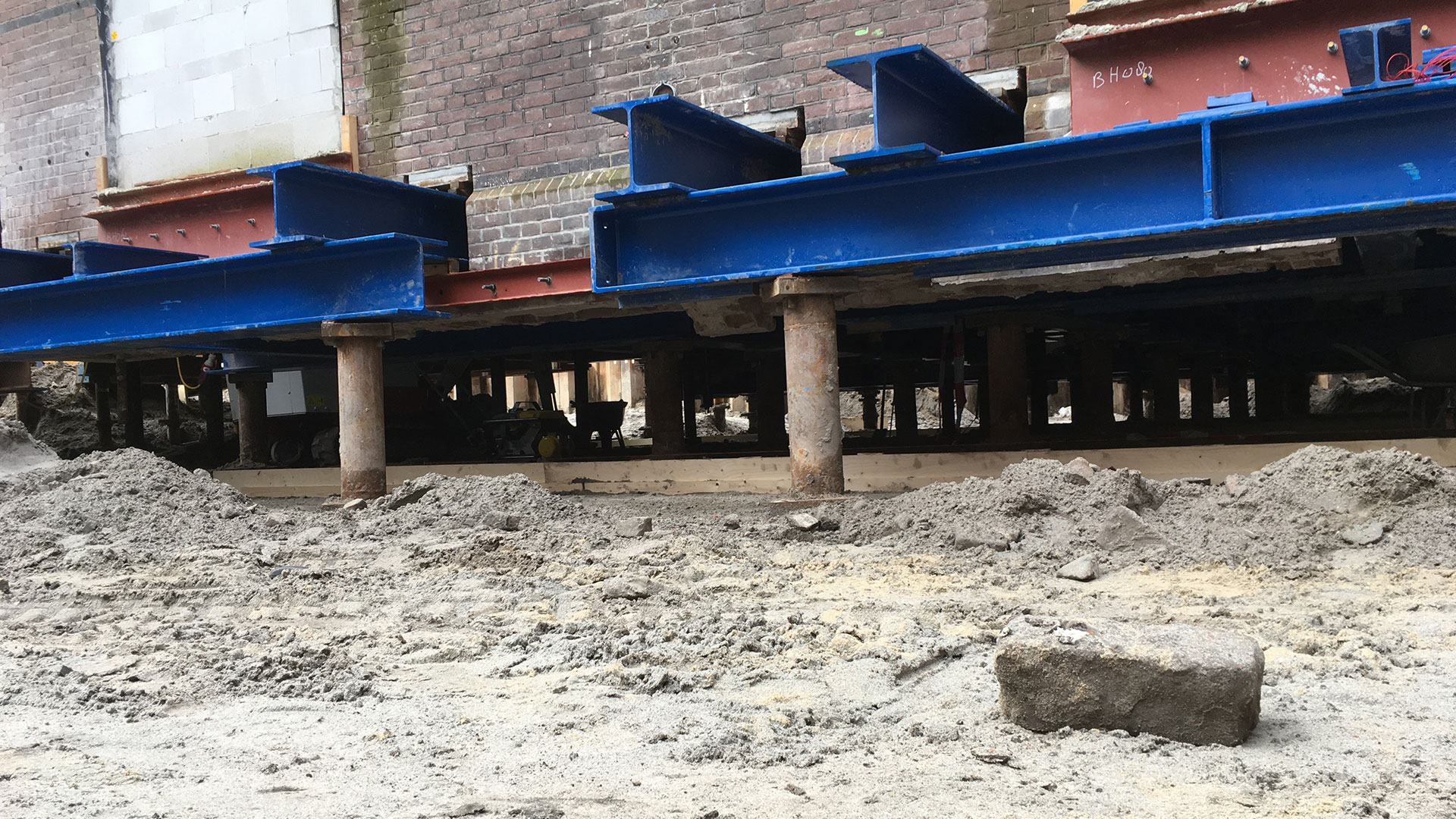 “Om de kelder te kunnen maken doorlopen we een aantal stappen”, vertelt Beljaars. “Als eerste hebben we het hele pand versterkt. Tijdens het verwijderen van asbest en het strippen van het gebouw, kwam de opdrachtgever er namelijk achter dat het gebouw een stuk fragieler was dan gedacht. Er bleek relatief veel slecht metselwerk te zijn, er zaten veel scheuren in wanden en op sommige plekken stonden de buitenmuren min of meer los. Daarom hebben we op allerlei plaatsen stalen balken aangebracht, doorgangen ‘dichtgeklost’ met houten frames en ramen dichtgemetseld om van het pand een stijf geheel te maken.”