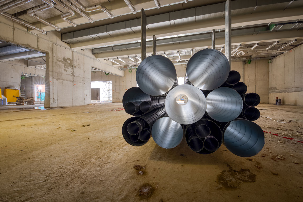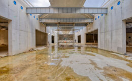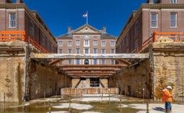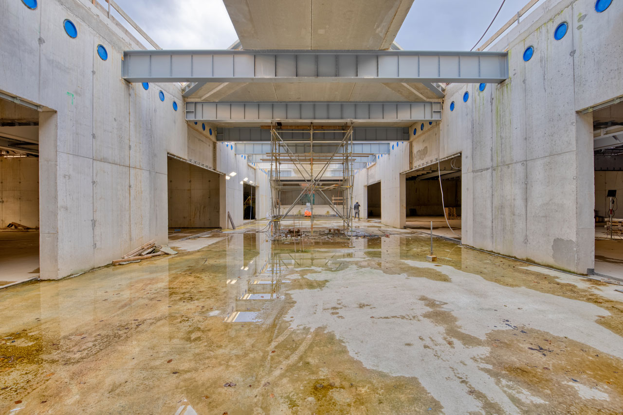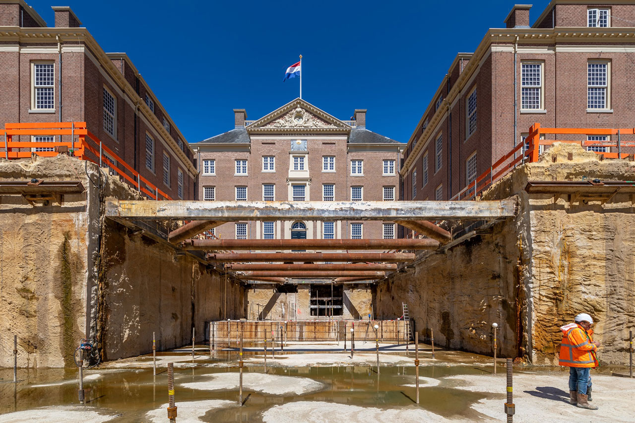 Op de foto hierboven is te zien dat de vier gazons aan de voorzijde van Paleis Het Loo al zijn verdwenen. Hier komt een ondiepe vijver met een glazen bodem die het plafond vormt van de nieuwe ondergrondse ruimte. Volker Staal en Funderingen (VSF) maakte hiervoor een bouwkuip van tien meter diep en een oppervlakte van bijna 4.500 m², opgebouwd uit een veelvoud aan funderingstechnieken afgestemd op de ondergrond en de locatie. Aan het beton is een zogeheten healing agent toegevoegd. Dit is een hulpstof waarmee toekomstige scheuren in het beton vanzelf herstellen. Zodra er scheurtjes ontstaan en vocht zijn weg naar binnen vindt, gaan de toegevoegde bacteriën zich vermenigvuldigen en kalksteen produceren, waarmee de scheur wordt opgevuld. Omdat het om een relatief nieuw product gaat, is het nog even afwachten hoe goed het in de praktijk – in deze specifieke omstandigheden – werkt.