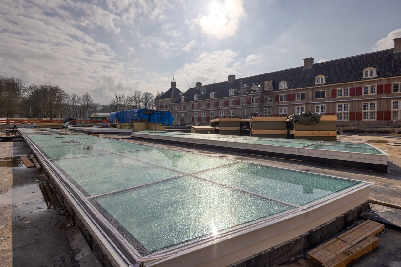 Inmiddels is de bouwkuip afgedekt met enorme glasplaten. Van bovenaf kun je hierdoor de moderne technische hoogstandjes bekijken, terwijl je van onderaf zicht hebt op de historische gebouwen. Zo krijgt Paleis Het Loo weer een voorplein met grandeur