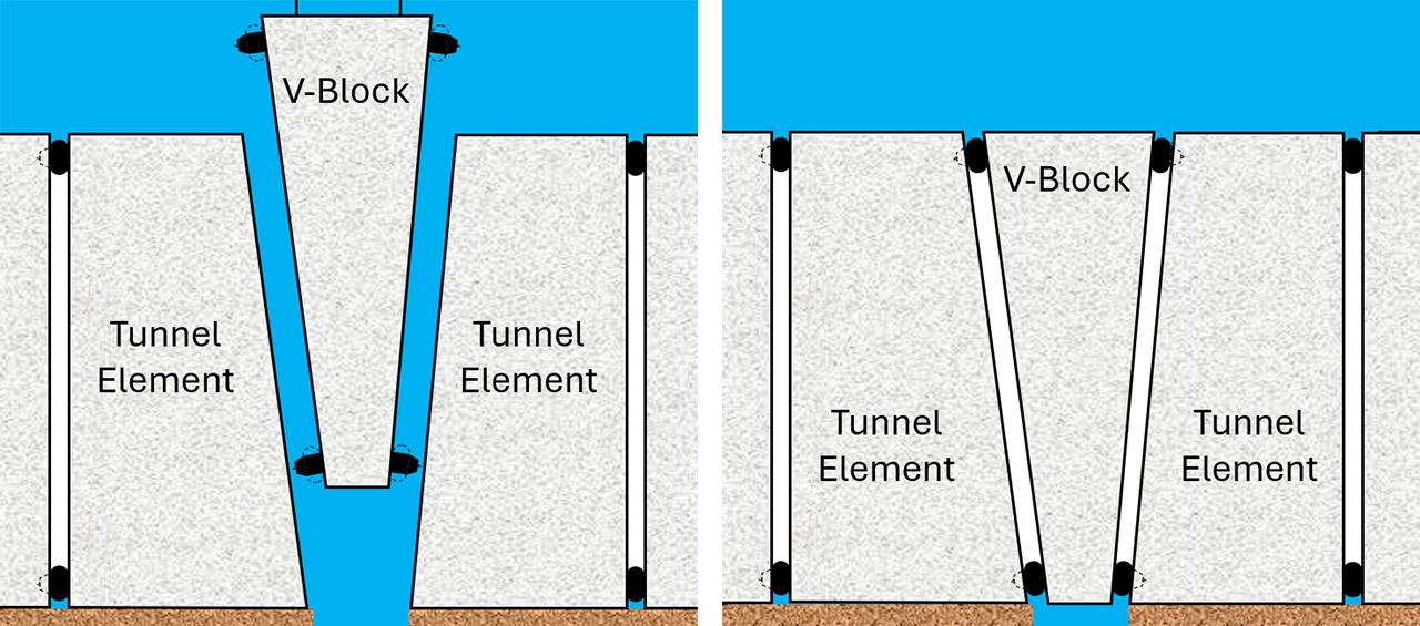 Hoewel de V-vormige tunnelsectie vaak de beste resultaten oplevert, bestaat er geen one-size-fits-all oplossing. Elk project heeft unieke omstandigheden, zoals ruimtelijke beperkingen en de locatie van de bouwkuip, die van invloed zijn op de uiteindelijke keuze van de techniek. In situaties met beperkte ruimte is onderzocht of het mogelijk is om het V-vormige tunnelelement te laten drijven en te installeren met standaard tunnelmaterieel. Hoewel dit theoretisch haalbaar is, vraagt deze methode om extra onderzoek naar de afdichtingsmechanismen, zoals pakkingen die met vijzels zijn geplaatst, om de risico’s te verminderen. De afdichting zou namelijk onder druk kunnen komen te staan door de structurele ondersteuningscondities van het element.