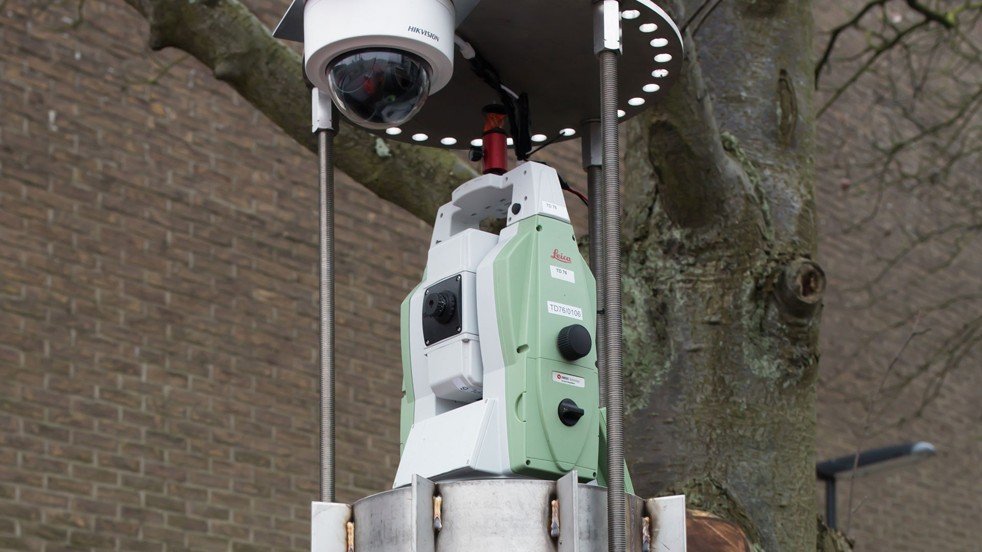 Voor de monitoring rond de ontvangstschacht heeft Fugro dertien robotic total stations gebruikt, gekoppeld in één netwerk. Deze meetstations maten elk uur de exacte positie van zevenhonderd prisma’s en stuurden de meetgegevens naar een online webportal. De prisma’s waren volgens een vast stramien op de gebouwen rondom de ontvangstschacht aangebracht op drie en zes meter hoogte, zodat niet alleen verticale bewegingen maar ook de scheefstand van gevels kon worden vastgesteld.