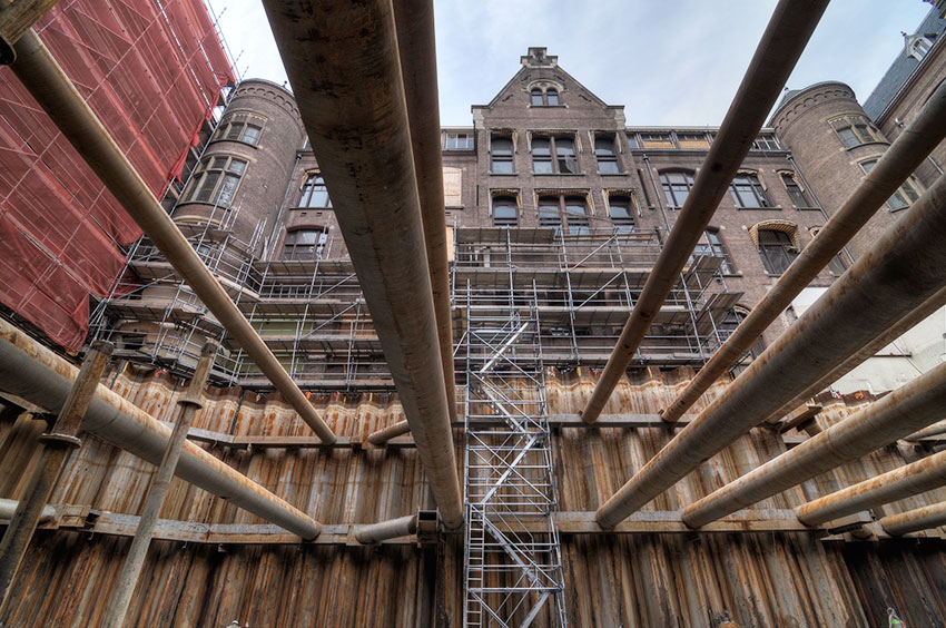 Voor de bouw van de kelder op de voormalige binnenplaats zijn twee bouwkuipen gemaakt, een diepe voor het deel van de kelder waarin onder andere een zwembad zit en een ondiepe voor het deel waarin zich de parkeergarage bevindt. De damwanden voor de bouwkuipen zijn hydraulisch in de bodem gedrukt. De diepe kuip is grotendeels nat ontgraven tot 10,9 meter beneden NAP, waarna een vloer van onderwaterbeton is gestort. Nadat het diepe deel van de kelder gereed was, is de ondiepe bouwkuip droog ontgraven. In beide bouwkuipen is met twee stempellagen gewerkt. (Foto: CRUX)
