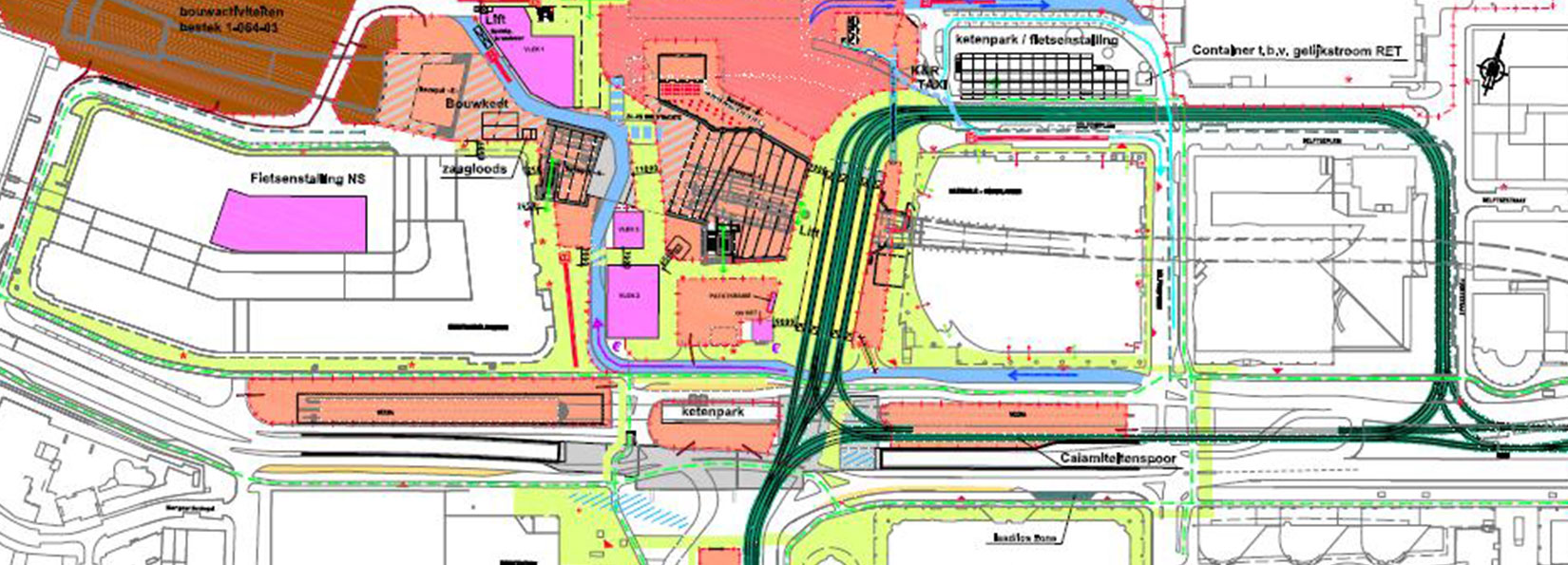 “Elke donderdagmiddag overleggen we met alle aannemers over de planning voor de week daarna. Daar maken we onderling afspraken. Dat betekent dat we altijd moeten schipperen. Het is geven en nemen, want de beschikbare ruimte is altijd te beperkt. Het gaat niet vanzelf, maar met behulp van de kaarten komen we er wel uit. Niet alleen ten aanzien van het gebruik van de bovengrond, maar naarmate het project vorderde ook steeds meer in driedimensionale zin, omdat we met de stationsoverkapping en de centrale hal omhooggingen en met de fietsenstalling de grond in.”