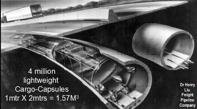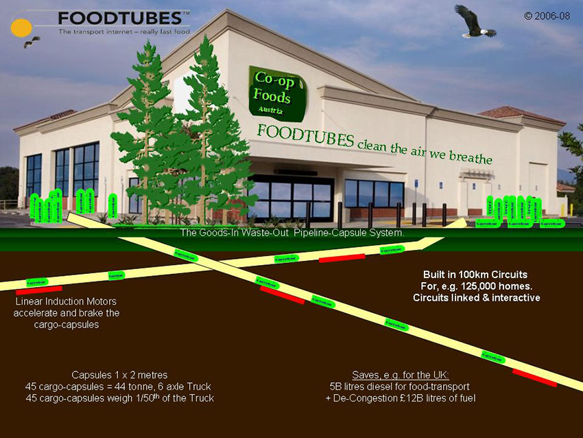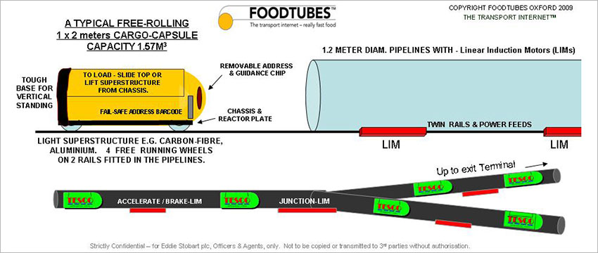 (Beelden via noelhodson.com) Het is slechts een concept, maar wie weet… Een groep wetenschappers uit Engeland stelt voor om ondergrondse buizenstelsels aan te leggen voor het transporteren van voedsel. De goederen worden verpakt in metalen capsules van twee meter lang, die met zesentwintig kilometer per uur door kunststof buizen schieten dankzij een lineaire inductiemotor en intelligente routeplanner. Er is al een plan opgesteld voor de Londonse buitenwijk Croydon, waar het systeem de uitstoot van CO2 met acht procent per jaar zou terugdringen, doordat er minder vrachtwagens hoeven te rijden..