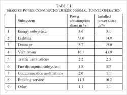 Rimma Dzuhusupova onderscheidt in haar onderzoek verschillende systemen die van invloed zijn op het totale energieverbruik van een tunnel. Naast grootverbruikers verlichting en ventilatie zijn dat pompen, verkeersinstallaties, brandbestrijdings-systemen, communicatiemiddelen, energiesubsystemen en gebouwgebonden installaties (o.a. verwarming en koeling kantoren).