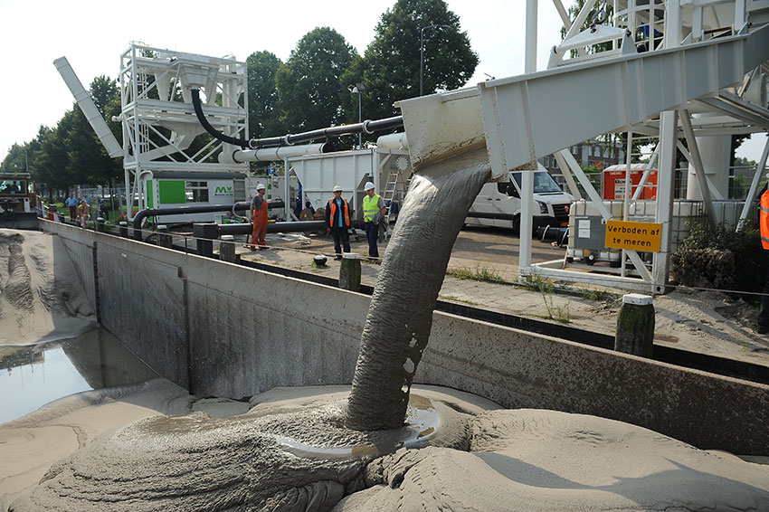 Groeneveld vervolgt: “We voeren het mengsel door een zeef die delen groter dan twintig millimeter opvangt, en pompen het zand-watermengsel vervolgens via een buis met een doorsnede van 350 millimeter over zeshonderd meter naar een schip in de Zuid-Willemsvaart. Daar gebruiken we cyclonen om het zand van het water te scheiden. Het water pompen we via een retourleiding terug naar de bouwput.”