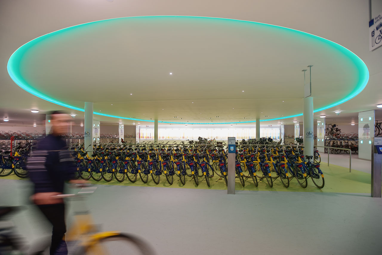 Van der Ree vervolgt: ”Vanwege deze bezwaren hebben wij een totaal ander ontwerp gemaakt. De langwerpige ruimte, die ongeveer het formaat heeft van een voetbalveld, hebben we opgedeeld in drie delen. Het middelste deel is ingericht als centrale ontvangsthal. Fietsers komen hier aan via een tapis roulant – een roltrottoir – en treffen er de beheerders en de incheckpunten voor het stallen van hun fiets. Om te benadrukken dat dit het centrum van de stalling is, hebben we in het plafond een cirkelvormige verhoging gemaakt die met ledlampen steeds een andere kleur krijgt. Verder hebben we in dit deel van de stalling alleen maar enkellaags fietsenrekken toegepast. Dat versterkt het ruimtelijke gevoel.”