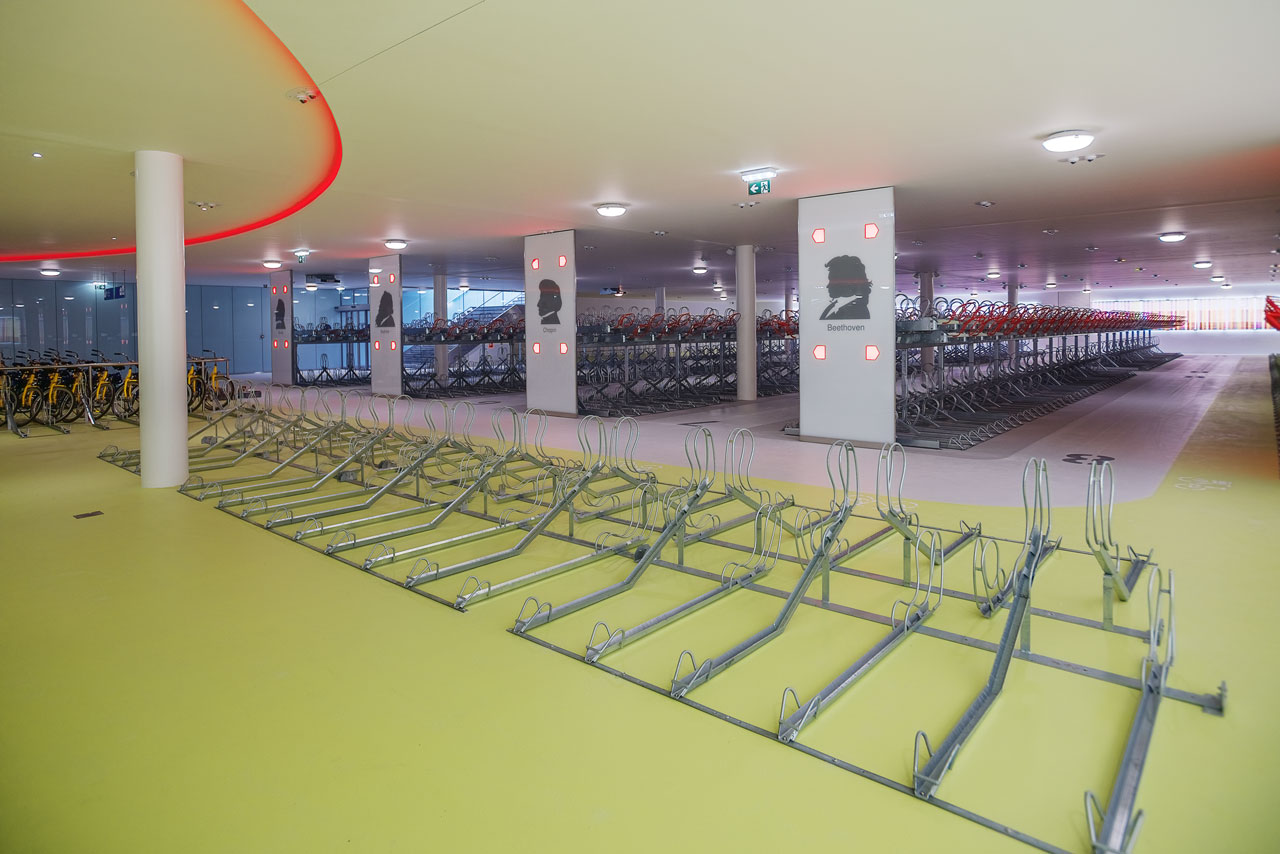 In de twee andere delen staan dubbellaags etagerekken. De paden liggen hier in de lengterichting van de stalling, waardoor er altijd zicht blijft op de centrale hal. Er is een dynamisch verwijssysteem toegepast om fietsers snel een lege plek te laten vinden. Camera’s aan het plafond nemen waar welke plekken vrij en bezet zijn. Aan de uiteinden van de genummerde paden, aan de kant van de ontvangsthal, staan grote panelen (met het silhouet en de naam van een componist) waarop met groen, oranje en rood licht aangegeven wordt of er in een rek nog plaats is. Als het licht op groen staat, zijn er nog diverse plekken vrij, zijn er nog maar enkele plekken dan brandt het licht op oranje en staat het licht op rood dan is het rek vol. Van de Ree: “In veel stallingen heb je tegenwoordig signalering waarbij wordt aangegeven hoeveel plekken er in de verschillende paden vrij zijn. Wij zijn ervan uitgegaan dat fietsers niet in dat aantal geïnteresseerd zijn, maar alleen willen weten of ze hun eigen fiets kwijt kunnen. Daarom hebben wij voor een simpel systeem gekozen met drie kleuren.”