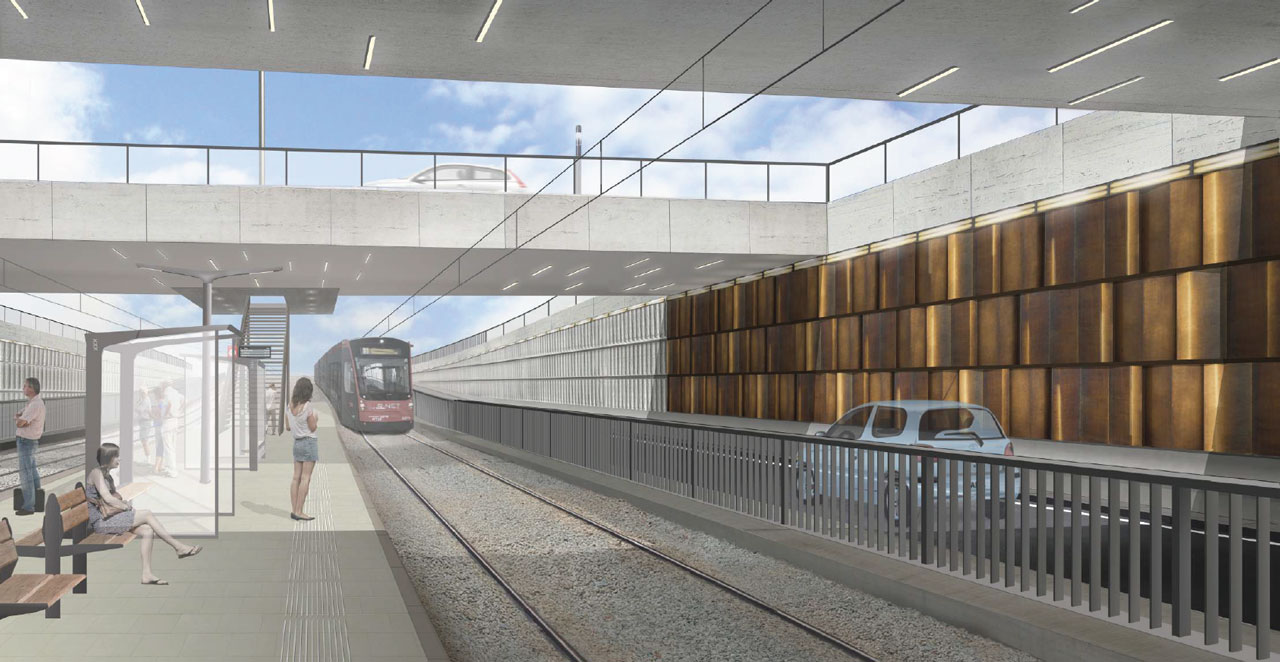 Tussen de Zuidas en Amstelveen-Zuid wordt de bestaande Amstelveenlijn omgebouwd tot een hoogwaardige tramverbinding die aansluit op het bestaande tram- en metronet van Amsterdam en op het spoorwegnet. (Beeld: impressie halte Kronenburg, uit het beeldkwaliteitsplan door POSAD)