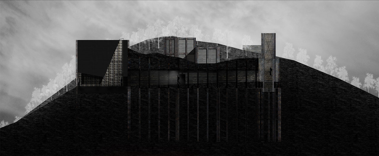 In mijn afstuderen is het proces bepalend geweest. Langzaam is de Borinage tot me doorgedrongen. Een proces dat begon met zwarte houtskooltekeningen van ondergrondse ruimtelijkheid waarin ik zocht naar licht. De sfeer en materialiteit uit mijn tekeningen heb ik omgezet naar een ruimtelijk ontwerp door gebruik te maken van het trägerbohlwandsysteem. De stalen H-profielen worden met een regelmatige tussenafstand van 2100 millimeter de bodem ingedrukt, als directe verwijzing naar de dagproductie van de mijnbouw. De contour van de grondkering vormt een mal en is de voetprint van het gebouw. Daarin zijn volumes in hout gebouwd als contramallen. De weggenomen grond wordt vermengd met beton en teruggebracht in de mal. Als eerbetoon aan de mijnwerkers heb ik daarna mijn werk verbrand, waardoor de grimmige aard van het gebouw tevoorschijn komt. De geest van de plek en de zinloosheid van de mijnbouw zijn in beton gegoten en daardoor tastbaar geworden.