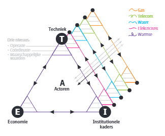 “In het model onderscheid ik in elke discipline verschillende lagen”, zegt Correljé, die toelicht waarom onderscheid in niveaus bijdraagt aan inzicht in onderlinge relaties. “Het eerste niveau in de I-component is die van de maatschappelijke waarden. Dan heb je het over aspecten als veiligheid, eerlijkheid, klimaat, milieu. Waarden op dat niveau zijn vastgelegd in wetten op landelijk en Europees niveau en zijn soms zelfs afhankelijk van internationaal recht. Die wetten bepalen welk soort relaties we met elkaar (kunnen) aangaan. Denk daarbij bijvoorbeeld aan de afspraak dat water- en gasbedrijven in Nederland niet ook eigenaar van het transportsysteem mogen zijn. Op niveau twee vind je afspraken op het gebied van economische arrangementen zoals joint ventures en contracten. Het laat zien hoe actoren op organisatorisch gebied aan elkaar verbonden zijn. Op het derde niveau laat je zien wat er met systemen wordt gedaan. Dan hebben we het over het operationele niveau van transacties, capaciteitsverdeling en tarieven.”