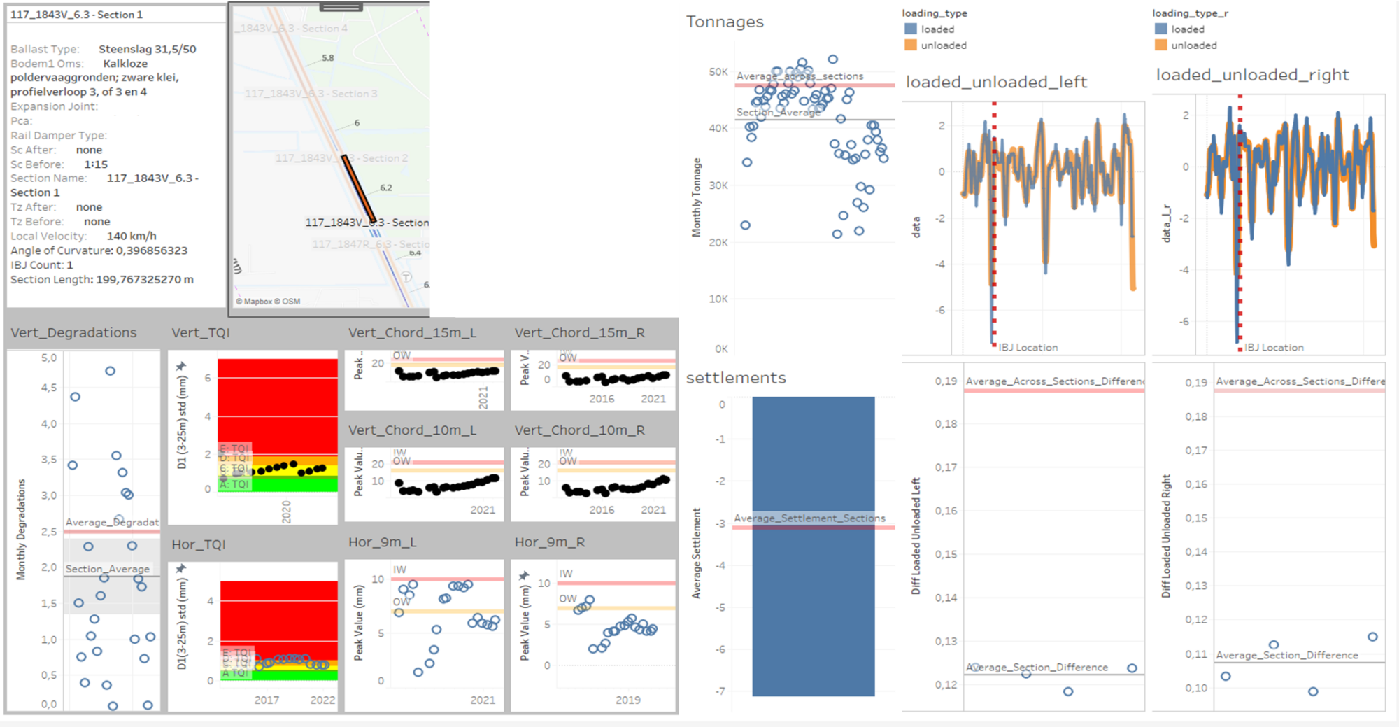Zodra alle datasets binnen de secties waren gekoppeld werd een dashboard gemaakt om de gegevens te visualiseren en nog meer trends af te leiden. Zo kan bijvoorbeeld de  eerwaartse trend in tonnage als gevolg van COVID-19 snel binnen de grafiek worden waargenomen. De geladen/ongeladen-verschillen vertegenwoordigen lokale stijfheid, en op locaties zijn de  verschillen hoog, zoals bij geïsoleerde blokvoeglocaties. Dit dashboard kan hun status visueel tonen. Andere elementen zijn de grenswaarden waarop tot onderhoud wordt besloten. Ook wordt de zettingssnelheid vanuit InSAR getoond.