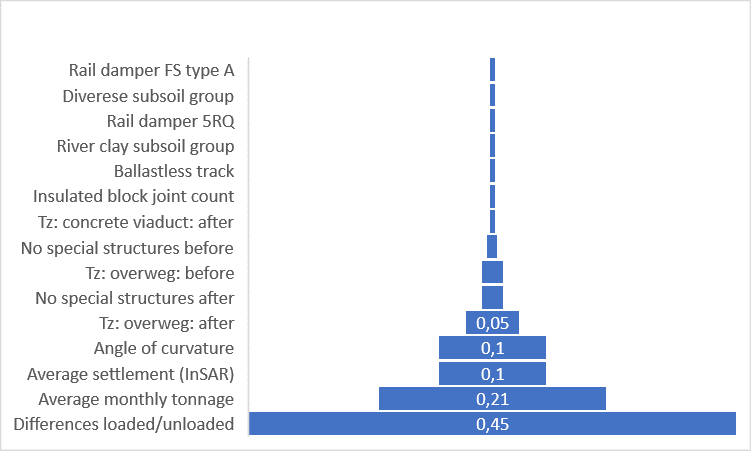 Al deze elementen op één scherm kunnen veel onthullen over het spoor en zijn gedrag. Weging van kenmerken (machine learning-methode) konden de grootste oorzaken van  degradatie uitlichten. In een casestudy van de spoorlijn Utrecht-Den Bosch speeldengeladen/ongeladen-verschillen een grote rol in degradatie, evenals maandelijkse belasting van het spoor, gemiddelde zetting vanuit InSAR en overgangszones. Probabilistische modellering voor elke gecreëerde sectie werd uitgevoerd om te linken naar de tijdsgegevens met behulp van scenario’s en Markov-ketenalgoritmen. Dit kan leiden tot betere besluitvorming met betrekking tot de toekomst.
