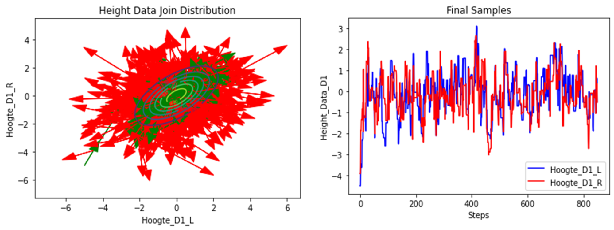 The contour plot represents the target distribution and the red arrows are rejected samples, while the green arrows are accepted samples. These sample per section the possible data for next measurement campaigns in a probabilistic manner.