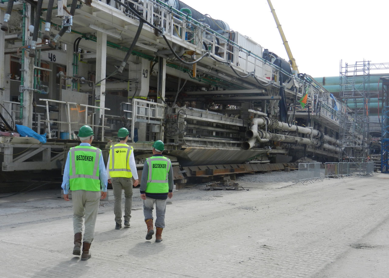 “Om er zeker van te zijn dat we bij de start van het boorproces – als we met de tunnelboormachine (TBM) door de kopse wand van de startschacht gaan – geen problemen met grondwaterlekkages krijgen, passen we een zogeheten bell toe. Dit is een waterdichte constructie binnen de startschacht die net iets groter is dan de TBM zelf. Binnen deze constructie brengen we met de TBM de eerste tunnelringen aan, alsof we al in de grond aan het boren zijn. Pas als de eerste ring binnen de bell waterdicht is ‘afgegrout’ met het staartspleetinjectiesysteem, boren we met de TBM door de frontale diepwand en begint de reis naar de ontvangstschacht.”