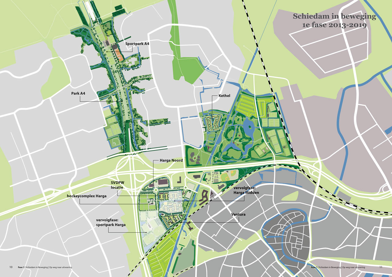 Kaart uit het uitvoeringsprogramma ‘Schiedam in Beweging: Op weg naar uitvoering’ met daarop de nieuwe sportparken en woningbouwprojecten. (Bron: gemeente Schiedam)