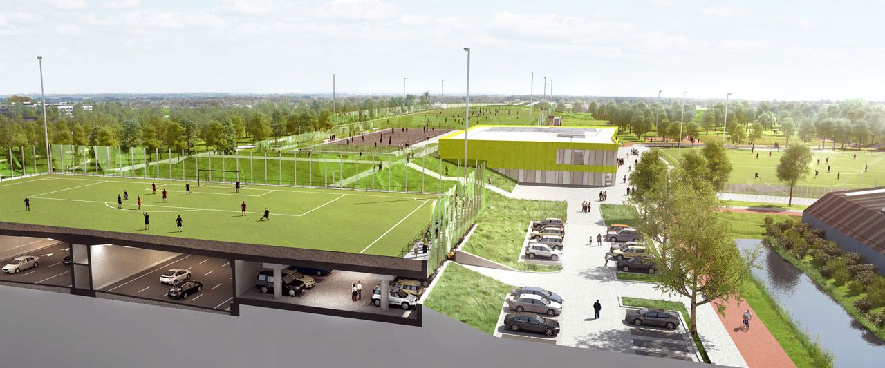 De aanleg van het dakpark werd geïntegreerd in de aanbesteding voor de tunnel. Vanwege de risico’s was het nodig dat het dakpark door dezelfde aannemer zou worden uitgevoerd. Het sportpark werd door VolkerInfra samen met Van Kessel Sport en Cultuurtechniek, ook een VolkerWessels-onderneming, aangelegd. Er werd gestart op basis van een plaatjesboek. Jil Ligterink: “Deze aanpak bevorderde de samenwerking. Met geven en nemen zijn we er in de uitvoering onderling steeds goed uitgekomen. Met de aanleg van de A4 hebben we een verkeerstechnisch probleem op kunnen lossen, en met de inpassing van de tunnel is Schiedam er beter op geworden. De combinatie van tunnel en sportaccommodaties is uniek. Daarmee was het voor ons een bijzonder project. We hebben laten zien wat we kunnen, en we konden onze kennis inbrengen en meehelpen het project haalbaar te maken. De belangrijkste les is dat goede afstemming goud waard is. We hebben samen met de opdrachtgever de risico’s kunnen verminderen door continu in gesprek te blijven. Zo hebben we misverstanden voorkomen en kon ieder zijn verantwoordelijkheid nemen.”