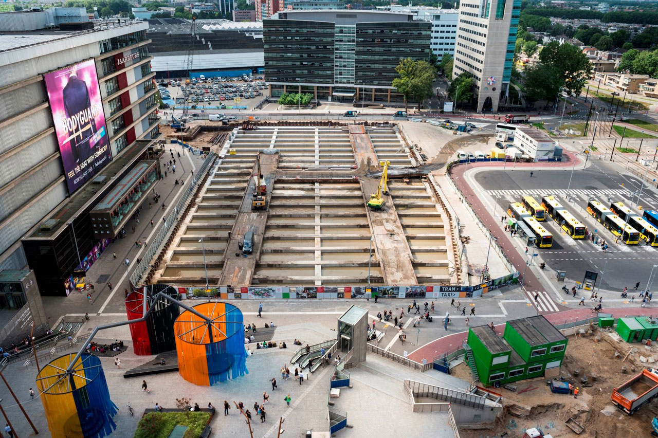 “De keuze voor dat stempelraam heeft de bouwcombinatie om verschillende redenen gemaakt”, legt Berkhout uit; hij zorgde voor de constructieve uitwerking. “Een belangrijke reden was ruimtewinst. Anders dan bij stalen stempels kun je over een betonnen stempelraam een bouwweg aanleggen. Daardoor heb je buiten de bouwput minder ruimte nodig, wat hier met alle bussen, taxi’s en voetgangersstromen van en naar het station erg aantrekkelijk was. Bijkomend voordeel is dat je minder grote kranen en betonpompen nodig hebt, omdat je vanaf de bouwweg in het midden van de bouwkuip kunt werken. Een betonnen stempelraam is bovendien duurzamer, omdat het een permanente constructie is. Staal moet je weer weghalen, wat ook nog eens kan leiden tot extra vervormingen. Dat zou hier een groot risico zijn geweest omdat een paar meter buiten de bouwput hoofdtransportleidingen lopen van een stadsverwarmingsnet, die absoluut niet mochten vervormen.”