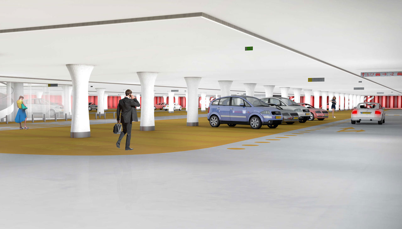 “Een van de grootste uitdagingen bij het ontwerpen van een ondergrondse parkeergarage is het creëren van een sfeer waarin mensen zich veilig voelen”, zegt Symons. “Sociale veiligheid vraagt om een overzichtelijke, lichte ruimte waarvan de begrenzing goed zichtbaar is en mensen eenvoudig hun weg van en naar de entrees kunnen vinden. Om dat te realiseren, heb ik in het ontwerp gekozen voor zoveel mogelijk daglicht bij de entrees, een logische markering en veel kleur. Zo worden de wanden rood, de parkeervakken geel, de rijbanen grijs en de plafonds wit. Verder ben ik voor de overzichtelijkheid uitgegaan van helemaal vlakke plafonds. Dat vereist dat alle leidingen in het beton worden gestort en de draagbalken worden geïntegreerd in de plafonds. Daarnaast heb ik gekozen voor speciaal vormgegeven kolommen, die aan de boven- en onderkant breder worden. Deze kolommen vergroten niet alleen de eigen identiteit van de garage, maar ook de overzichtelijkheid, omdat ze op ooghoogte relatief smal zijn.”
