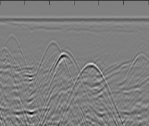 Dit beeld is gemaakt met behulp van grondradar: een radarsignaal gaat de grond in en de respons wordt in beeld gebracht. Theoretisch is het zo dat elk type object (munitie, kabel) een andere respons genereert. Dat zou betekenen dat je aan het lijntje in de grafiek kunt zien wat er op dat punt in de grond ligt. Maar helaas: de grondsamenstelling boven het object heeft zoveel invloed op het signaal, dat je geen harde conclusies kunt verbinden aan het type respons. Een hobbel in de grafiek betekent in feite alleen ‘hier zit iets’, en door na te graven of andere informatiebronnen (oude kaarten, het Kadaster) te raadplegen, kun je bepalen wat dat ‘iets’ is.