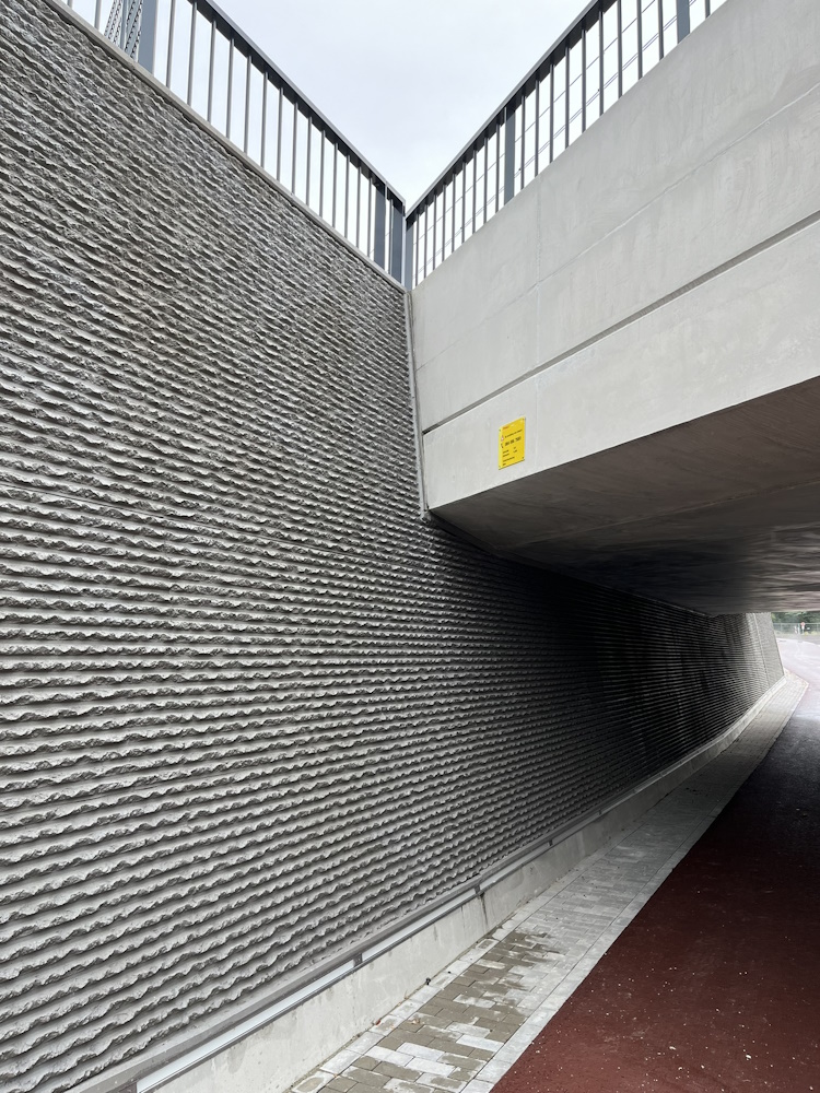 In de onderdoorgang zijn twee oplossingen naast elkaar gezet. In een 25 meter lange wand van de pompkelder onder een van de toeritten is de vooraf berekende scheurvorming opgevangen met de traditionele hoeveelheid horizontale wapening. In de tegenoverliggende wand is 35% minder horizontale wapening gebruikt, waarbij de toepassing van zelfhelend beton ervoor moet zorgen dat optredende scheurvorming wordt hersteld. Het is het eerste infrastructurele project waarbij zelfhelend beton is gecombineerd met wapeningreductie. De extra duurzaamheidswinst van het pilotproject zit in de CO2-reductie als gevolg van de wapeningreductie. De totale reductie kan oplopen tot zo’n 10% van de totale CO2-uitstoot van een betonconstructie (beton en wapening).