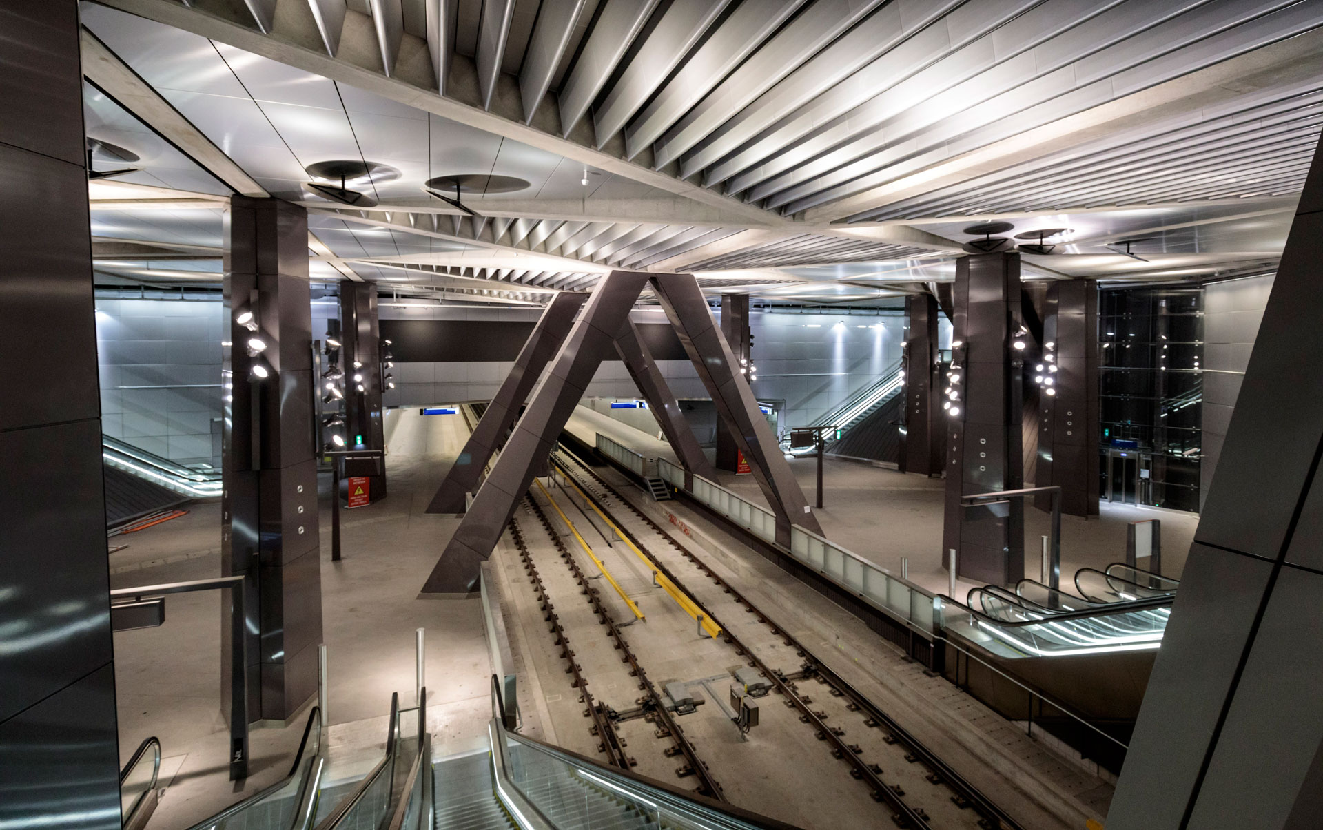 Het nieuwe ondergrondse metrostation van Amsterdam Centraal (hier op de foto) wordt ook wel De Kathedraal genoemd vanwege de enorme afmetingen. Op dit station stappen straks dagelijks 35.000 reizigers in de metro op de Noord/Zuidlijn. Het metrostation werd ontworpen door Jan Benthem van Benthem Crouwel Architecten. Dit bureau maakte het ontwerp van zeven stations. Rokin, Vijzelgracht, De Pijp en Europaplein bevinden zich ondergronds. Onder de Ferdinand Bolstraat in De Pijp liggen de perrons onder elkaar op 16,5 en 26,5 meter diepte.
