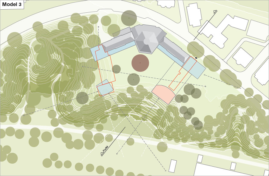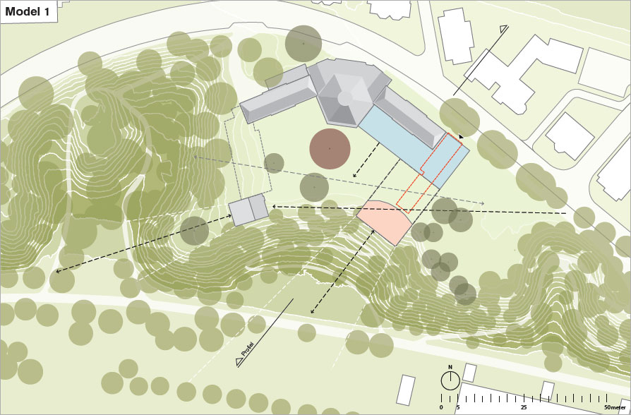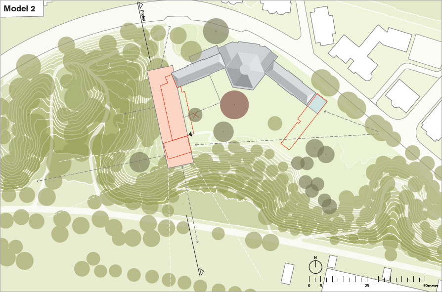 Karres+brands heeft ter inspiratie drie uitbreidingsmodellen geschetst. De tentoonstellingszalen zijn (deels) onder het maaiveld geplaatst om het zicht op de tuin niet te belemmeren. De zalen steken uit de stuwwal. Hierdoor krijgt het museum een betere zichtbaarheid vanaf het Onderlangs en is er vanuit de zalen een mooi uitzicht. (Beelden: karres+brands)
