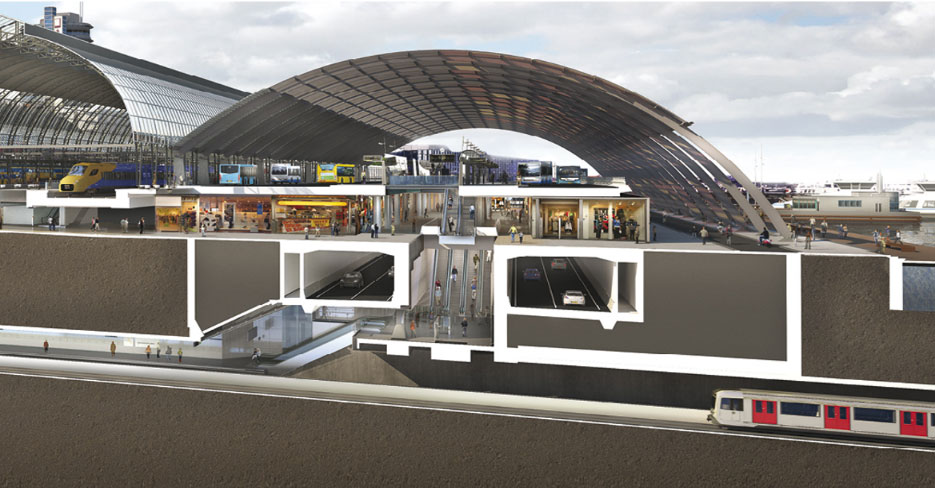 Beij: “Een ander voorbeeld is Amsterdam CS. Aan de kant van het IJ liggen hier vier lagen infrastructuur boven elkaar. Op het onderste niveau kruist de Noord/Zuidlijn het treinstation en bevindt zich het nieuwe metrostation. Op het niveau hierboven ligt parallel aan het IJ de Michiel de Ruijtertunnel met twee tunnelbuizen voor wegverkeer. Op het dak van deze tunnel is een winkelcentrum in een hal van het station. En bovenop dit winkelcentrum, op het hoogste niveau, ligt het busstation dat is overdekt door een grote gebogen glazen kap. Tussen de tunnelbuizen van de Michiel de Ruijtertunnel zijn er (rol)trappen die het metro-, trein- en het busstation met elkaar verbinden. Meervoudig ruimtegebruik ten voeten uit!”
