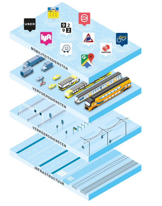 Illustratie van het mobiliteitssysteem in lagen volgens de Raad voor de leefomgeving en infrastructuur. (Bron: Van B naar Anders)