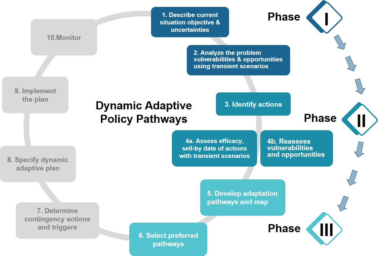 In het afstudeeronderzoek van Yagos wordt DAPP toegepast op wegtunnels door gebruik te maken van verschillende kwantitatieve en kwalitatieve assetmanagementtools. Hiermee wordt het mogelijk om de dynamiek van onzekerheden op de lange termijn mee te nemen. Door maatregelen op een dynamische en flexibele manier voor te stellen, en niet statisch en robuust, zijn er twee strategische routekaarten ontwikkeld. Het DAPP-model bestaat uit tien methodologische stappen (zie figuur hieronder), en in dit onderzoek zijn de eerste zes uitgevoerd in drie fasen.