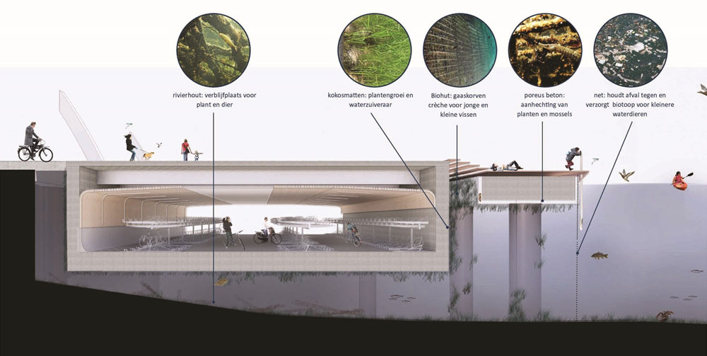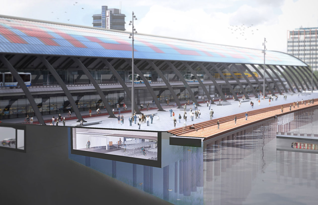 Pinas is erg te spreken over alle aanpassingen: “De IJzijde van het station is een dynamisch deel van de stad en een belangrijk mobiliteitsknooppunt. Een plek waar een aantrekkelijke openbare ruimte heel belangrijk is. Dat geeft je de verantwoordelijkheid om goede keuzes te maken. Dat zie je terug in dit ontwerp. Zo is het op allerlei manieren duurzaam. De kolomloze constructie maakt het bijvoorbeeld mogelijk om het casco later te hergebruiken. Verder zijn de installaties energiezuinig en low-tech en zijn er klimaatadaptieve maatregelen getroffen. Er wordt bijvoorbeeld voor gezorgd dat alle neerslag via het dak afstroomt naar het IJ en niet het riool belast. Verder zijn er onder water, onder en naast de stalling, diverse maatregelen getroffen om onder meer broedplaatsen voor vissen te creëren en de onderwaternatuur te bevorderen. Los van de inhoud ben ik ook heel tevreden dat we echt samen, in goed overleg, tot alle verbeteringen zijn gekomen.”
