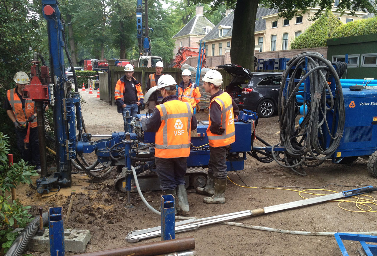 “De bouwkuipen moeten we zien te maken vlak naast de gemetselde gevels van de monumentale panden”, zegt Jens de Vries projectleider bij VSF. “Dat maakt deze klus spannend, omdat de gevels vanzelfsprekend niet beschadigd mogen raken. Voor ons stond dan ook vanaf het begin vast dat we een trillingsarme techniek moesten gebruiken. Voor de wanden van de grote bouwkuip, die tot ongeveer veertien meter beneden maaiveld komen, hebben we een afweging gemaakt tussen CSM- en diepwanden. Uiteindelijk hebben we gekozen voor CSM-wanden.”