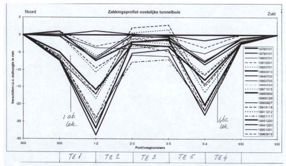 Zettingsmetingen bij de Kiltunnel (links) en de Heinenoordtunnel (onder). Op de horizontale as staan de meetpunten aangegeven; deze zijn verspreid over de lengte van de tunnel. De kleur of het type lijn correspondeert met het moment van meten. De grafiek van de Kiltunnel toont de metingen van 1977 t/m 2016. Voor de Heinenoordtunnel zijn de metingen van 1978 t/m 1996 weergegeven. In beide gevallen is te zien dat de zetting groter is dan de vooraf geschatte 0-1 mm. (Bron: scriptie Bob van Amsterdam)