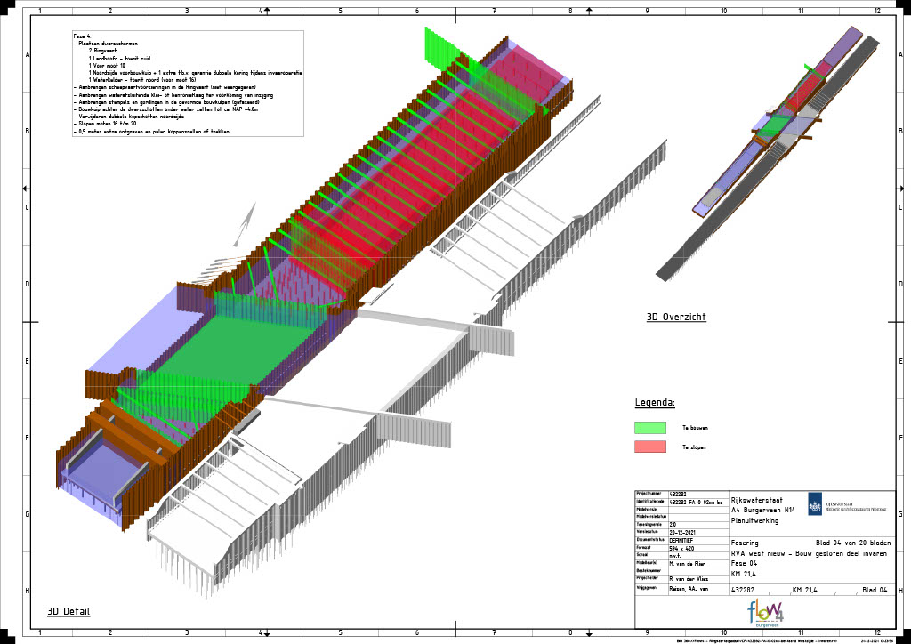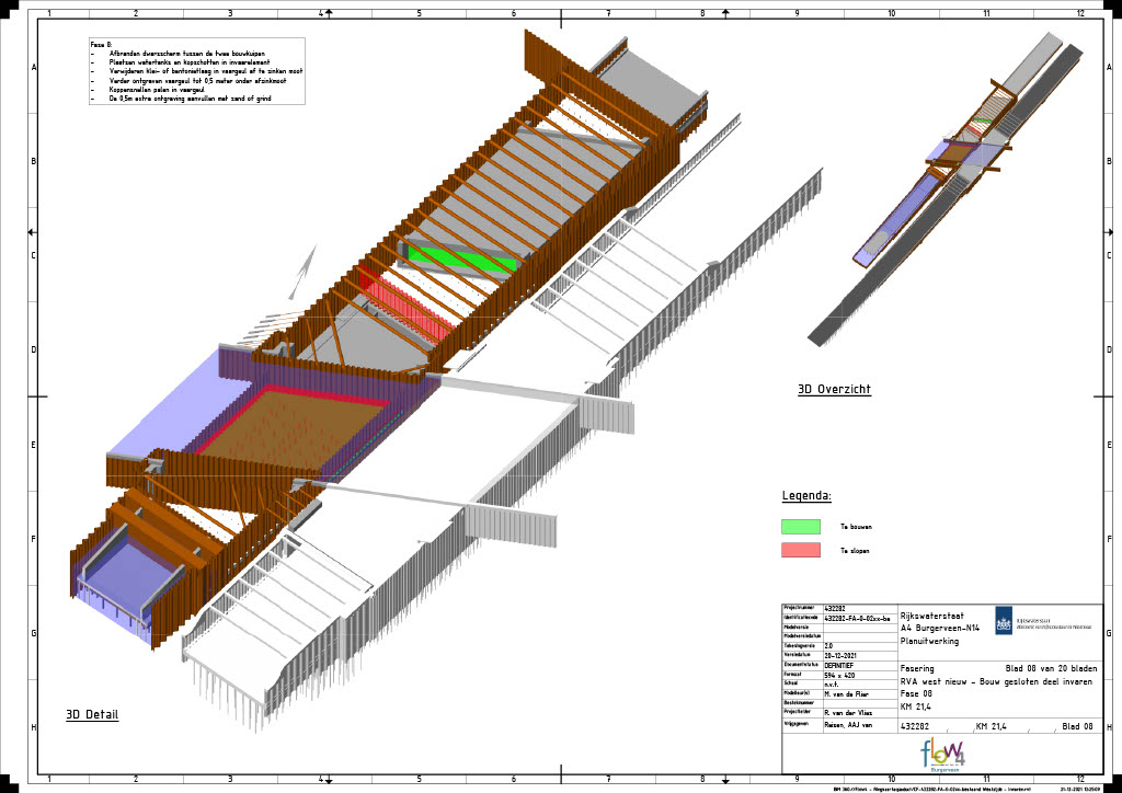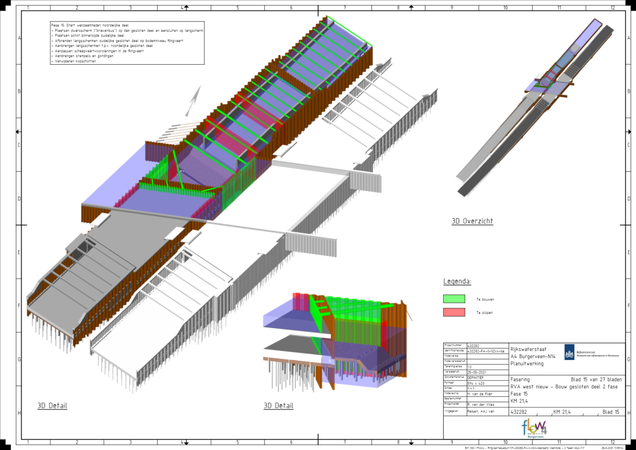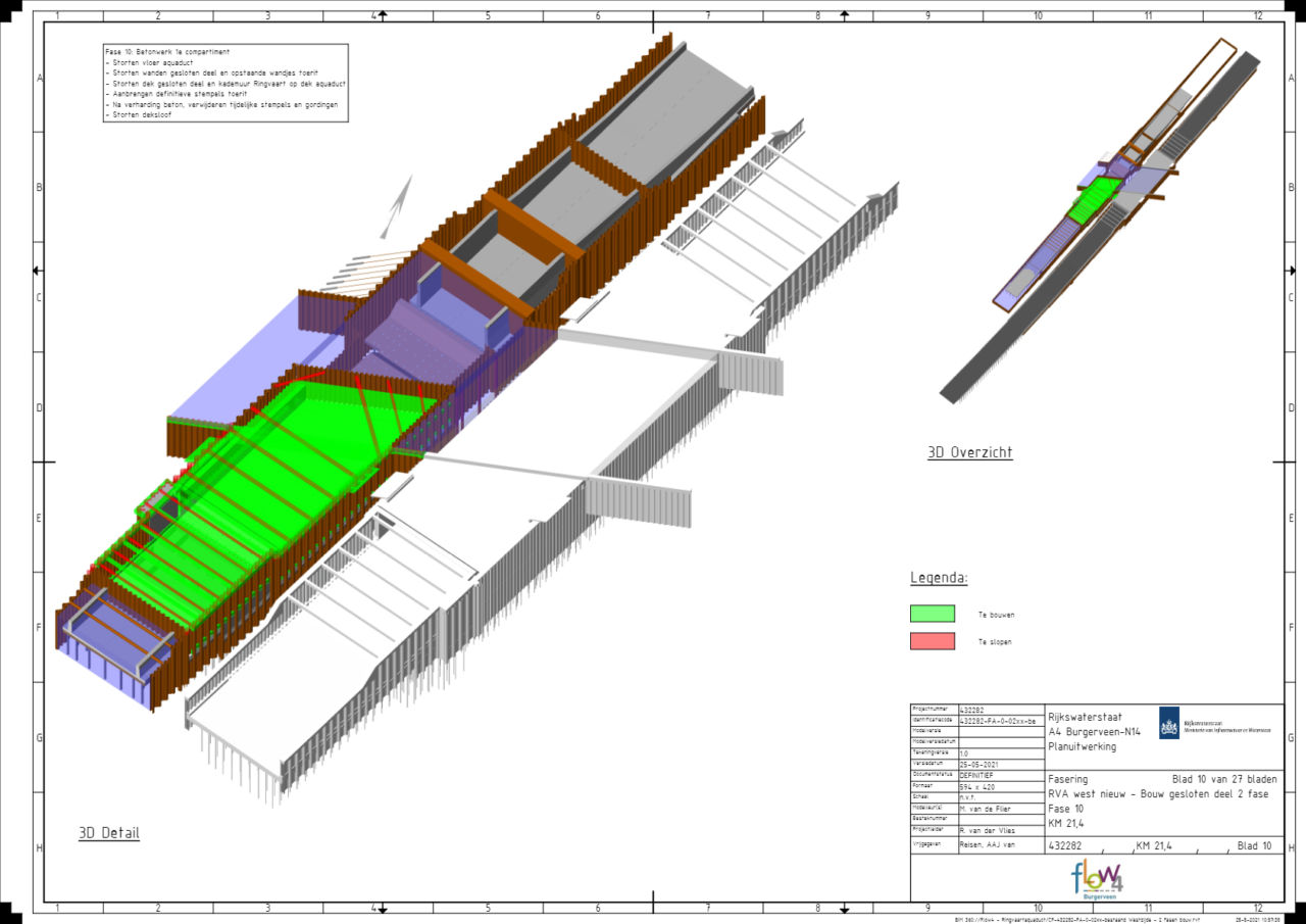 Van der Vlies: “De fasering van de varianten hebben we uitgewerkt in een soort stripverhalen. De eerste werkzaamheden zijn bij beide varianten hetzelfde. Als start worden rondom de toeritten damwanden ingebracht die aansluiten op de beschoeiing van het kanaal. Daarna worden er in beide toeritten dubbele, waterdichte kopschotten en aan de onderzijde groutkolommen aangebracht om onderloopsheid tegen te gaan. Langs het gesloten deel van het aquaduct worden damwanden geplaatst. De bovenkant van deze damwandschermen komt op het niveau van de bodem van de ringvaart, zodat de scheepvaart gebruik kan blijven maken van de waterweg. Vervolgens wordt het aquaduct tussen de kopschotten onder water gezet en worden de kades en de grond daarachter verwijderd en wordt het gesloten deel en een deel van de toeritten onder water gesloopt. Hierna zijn de werkzaamheden bij de twee varianten verschillend.”
