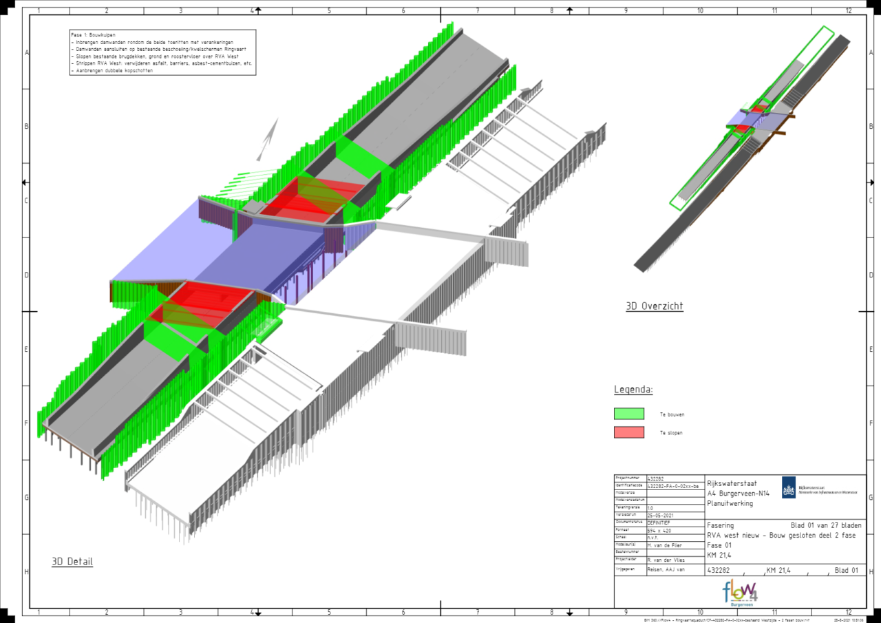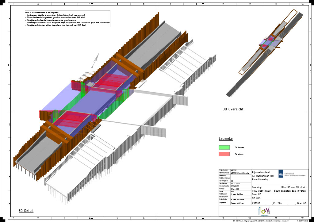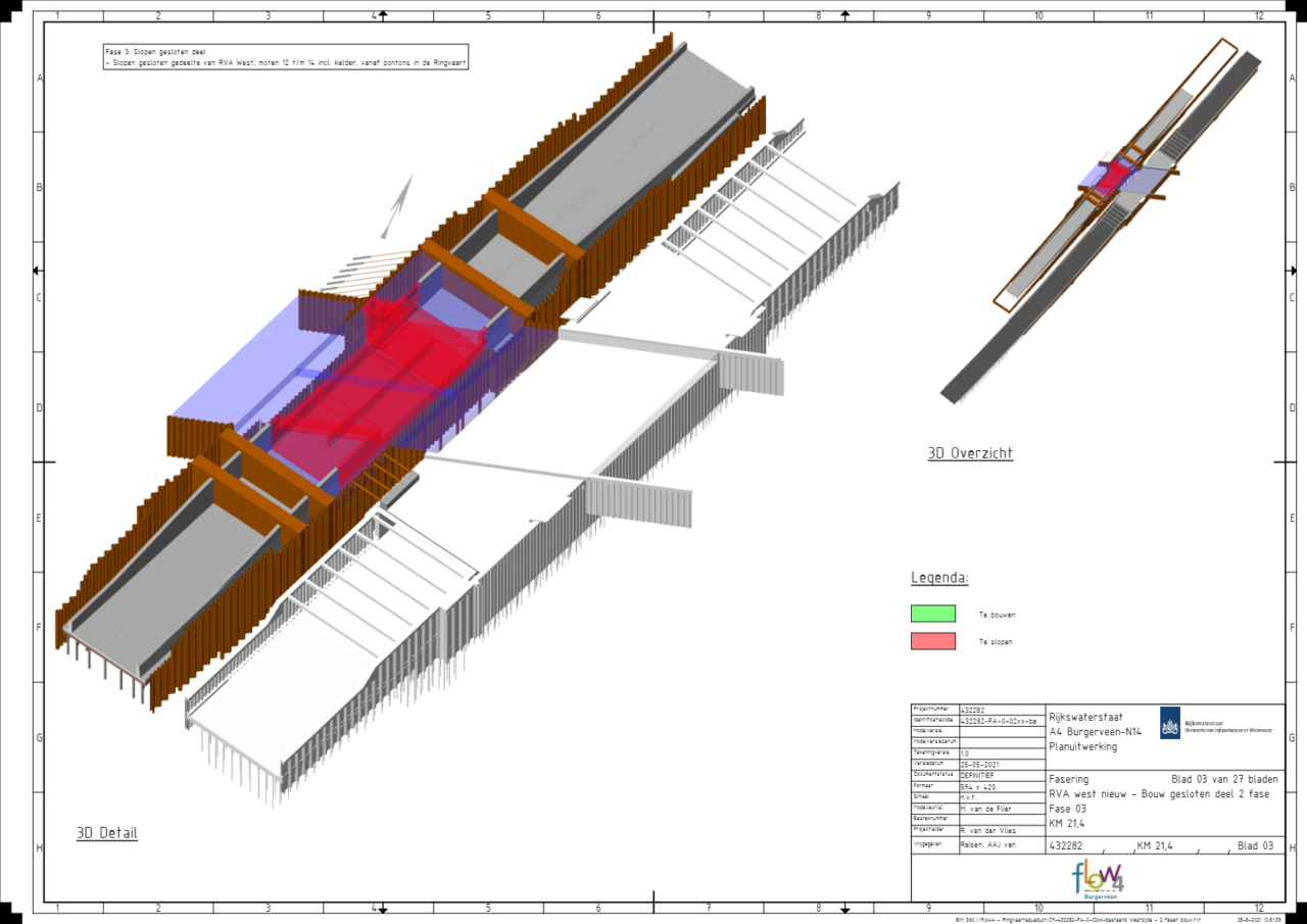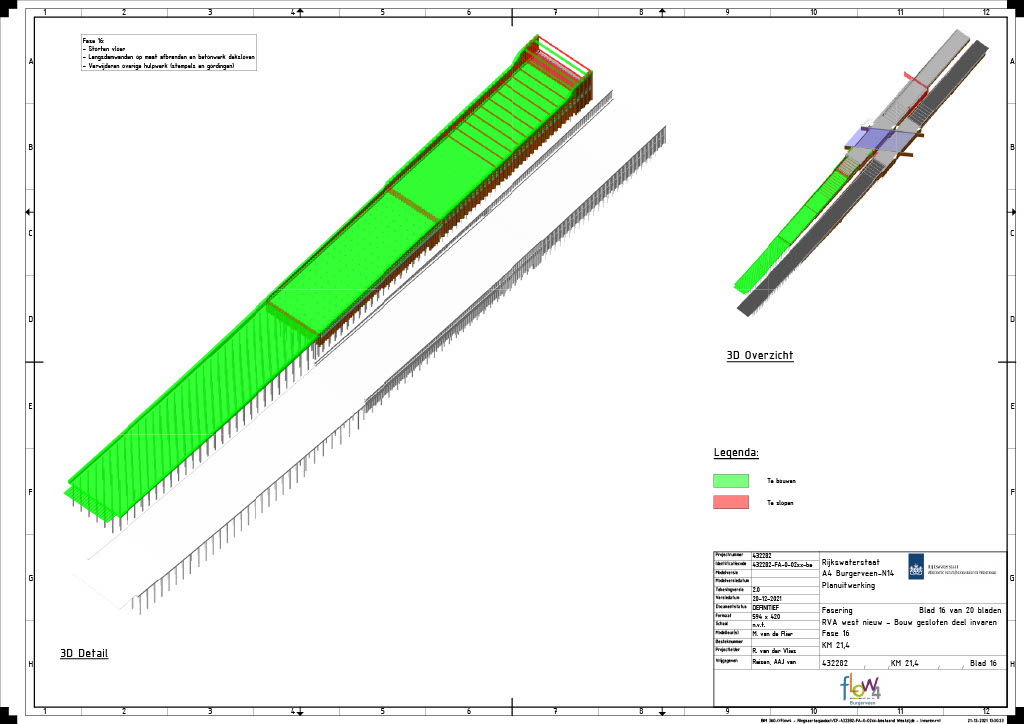 Van der Vlies: “De fasering van de varianten hebben we uitgewerkt in een soort stripverhalen. De eerste werkzaamheden zijn bij beide varianten hetzelfde. Als start worden rondom de toeritten damwanden ingebracht die aansluiten op de beschoeiing van het kanaal. Daarna worden er in beide toeritten dubbele, waterdichte kopschotten en aan de onderzijde groutkolommen aangebracht om onderloopsheid tegen te gaan. Langs het gesloten deel van het aquaduct worden damwanden geplaatst. De bovenkant van deze damwandschermen komt op het niveau van de bodem van de ringvaart, zodat de scheepvaart gebruik kan blijven maken van de waterweg. Vervolgens wordt het aquaduct tussen de kopschotten onder water gezet en worden de kades en de grond daarachter verwijderd en wordt het gesloten deel en een deel van de toeritten onder water gesloopt. Hierna zijn de werkzaamheden bij de twee varianten verschillend.”