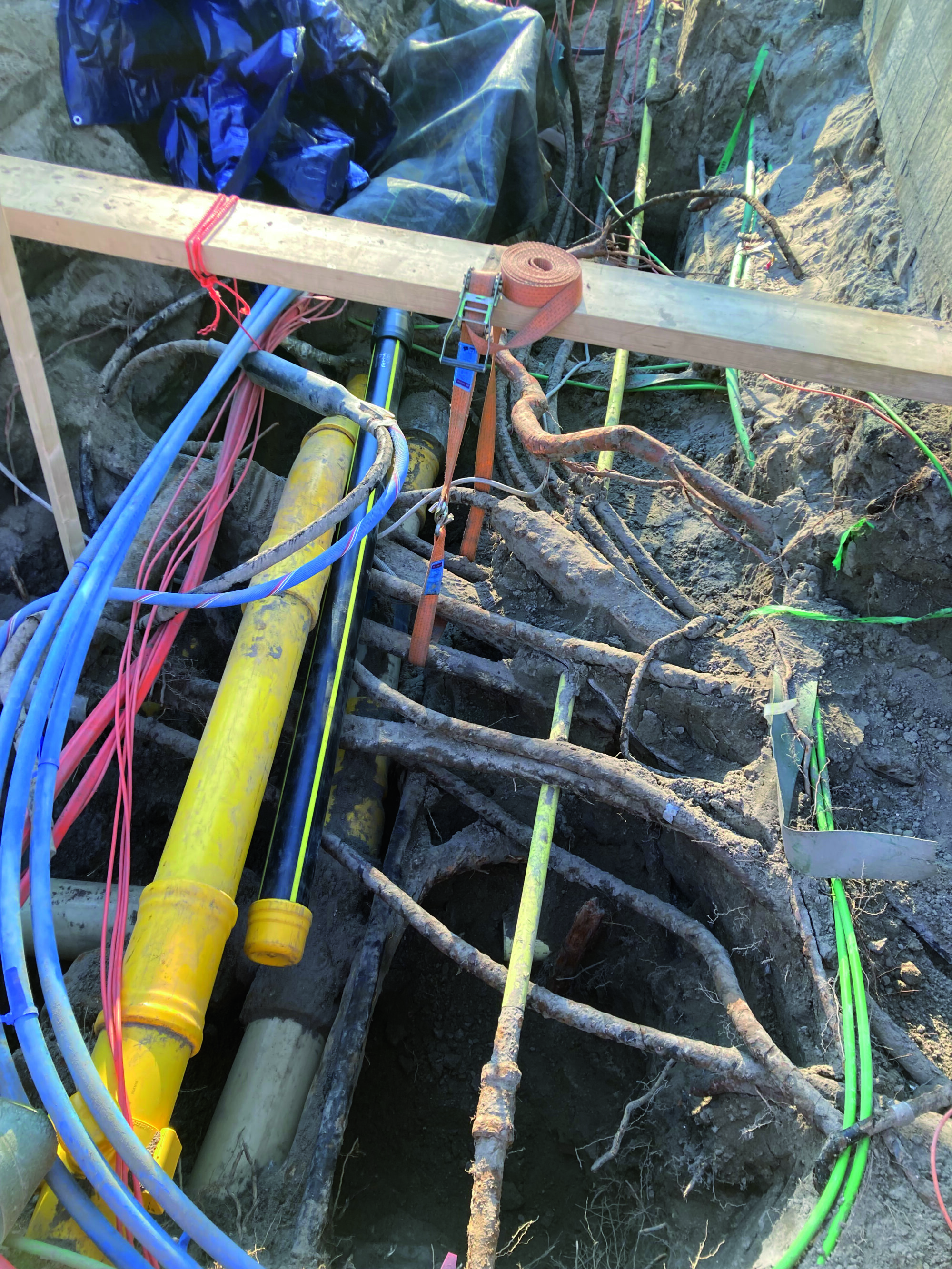 Boomwortels in de buurt van gasleidingen kunnen flinke risico’s opleveren. Marcel: “Normaal gebruiken we slagvast PVC-leidingen. De moffen daarvan zijn eigenlijk losse verbindingen die met rubber in elkaar klemmen. Als boomwortels druk uitoefenen of trekken, kunnen deze uit elkaar schuiven, met gaslek tot gevolg. Daarom gebruiken we binnen twee meter vanaf bomen altijd PE(polyethyleen)-leidingen, die zijn lasbaar en hebben dit probleem niet.” In de Stationsstraat zijn uiteindelijk strakke indelingen gemaakt voor alles wat de grond in moest. Kabels en leidingen zijn vervangen, verlegd waar nodig en weer onder de stoep geplaatst. Daarnaast kwam, op meer dan twee meter afstand, de groenstrook met daartussen een wortelscherm om de kabels en leidingen te beschermen tegen boomwortels.