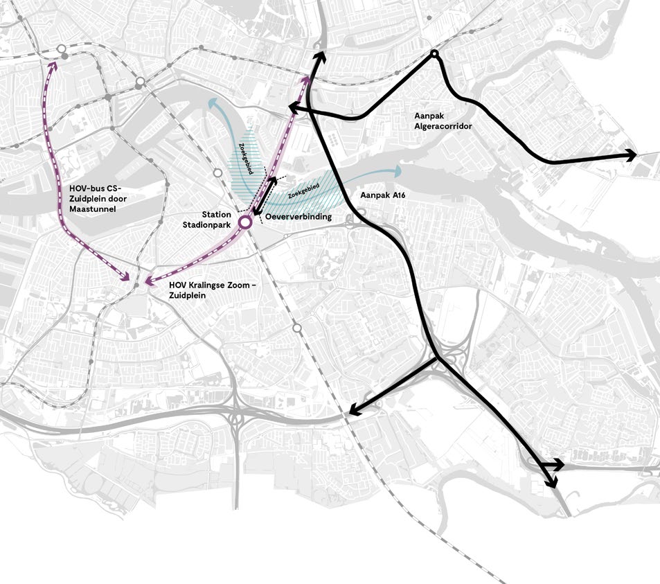 De MIRT-verkenning richt zich op een breed pakket aan maatregelen, die binnen drie deelstudies worden onderzocht. Een daarvan richt zich op een nieuwe oeververbinding en het verbeteren van het openbaar vervoer, waarbij geldt dat de oeververbinding in ieder geval geschikt moet zijn voor voetgangers, fietsers en ov. Projectleider Viktor Timmermans vertelt: “Met twee ingenieursbureaus hebben we alle opties in kaart gebracht, evenals de mogelijkheden om het ov tussen Rotterdam-Noord en -Zuid te verbeteren. Daarbij is gekeken naar locaties voor bruggen en tunnels met de bijbehorende tracés in combinatie met verschillende ov-kwaliteiten.”