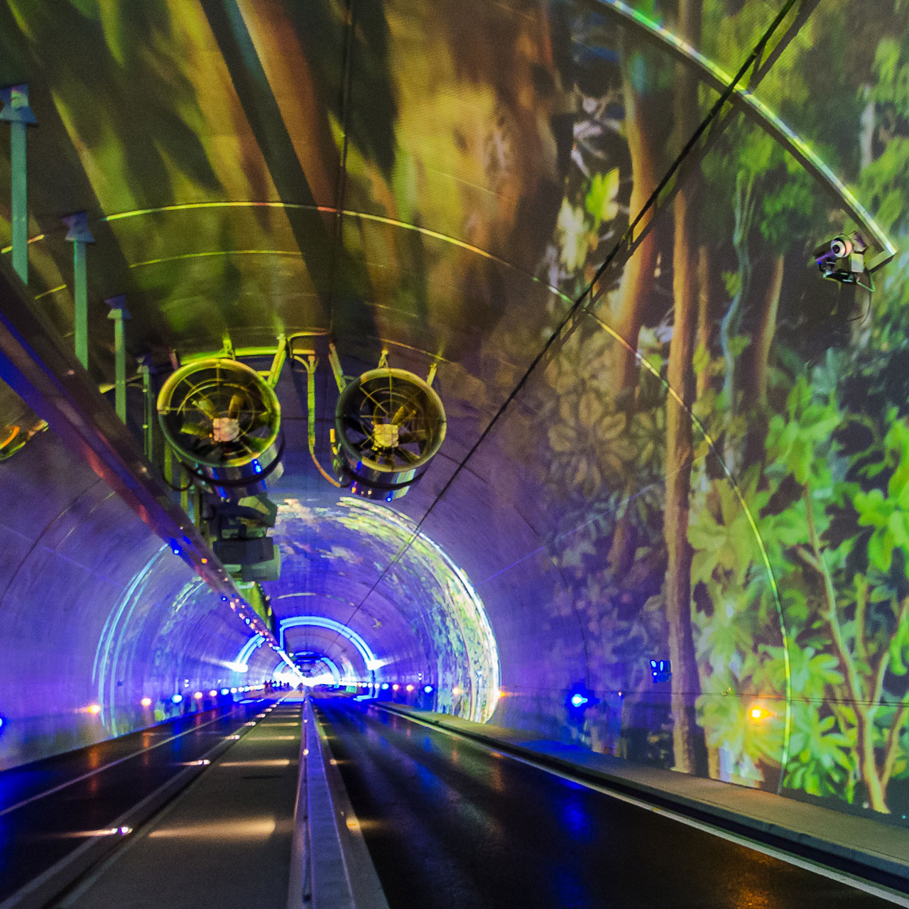 Verf en tegeltjes zijn relatief onveranderbaar. Licht en geluid zijn een stuk flexibeler. In Lyon is eind 2013 een nieuwe, ruim twee kilometer lange tunnel onder het centrum opengesteld waar fi etsers (en voetgangers en bussen) enorme projecties krijgen voorgeschoteld met bijpassend geluid. Van abstracte kunst tot realistische tuintaferelen.